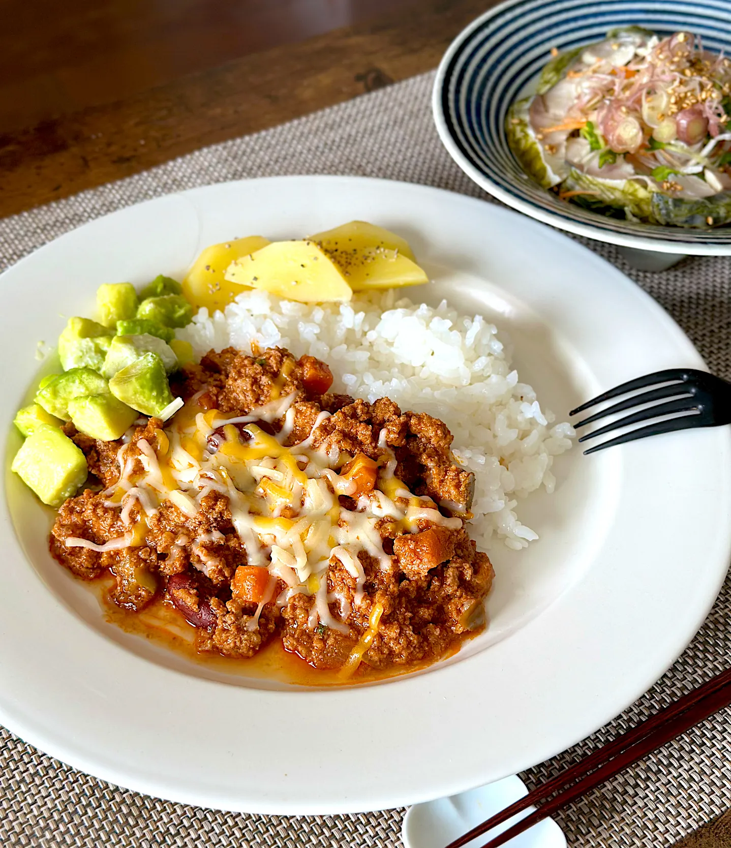冷凍ごはんとチリコンカンとじゃがいもを一緒に蒸し器で蒸して、追いチーズ、ダイスアボカド追加で、ボリュームアップでいただきます😋