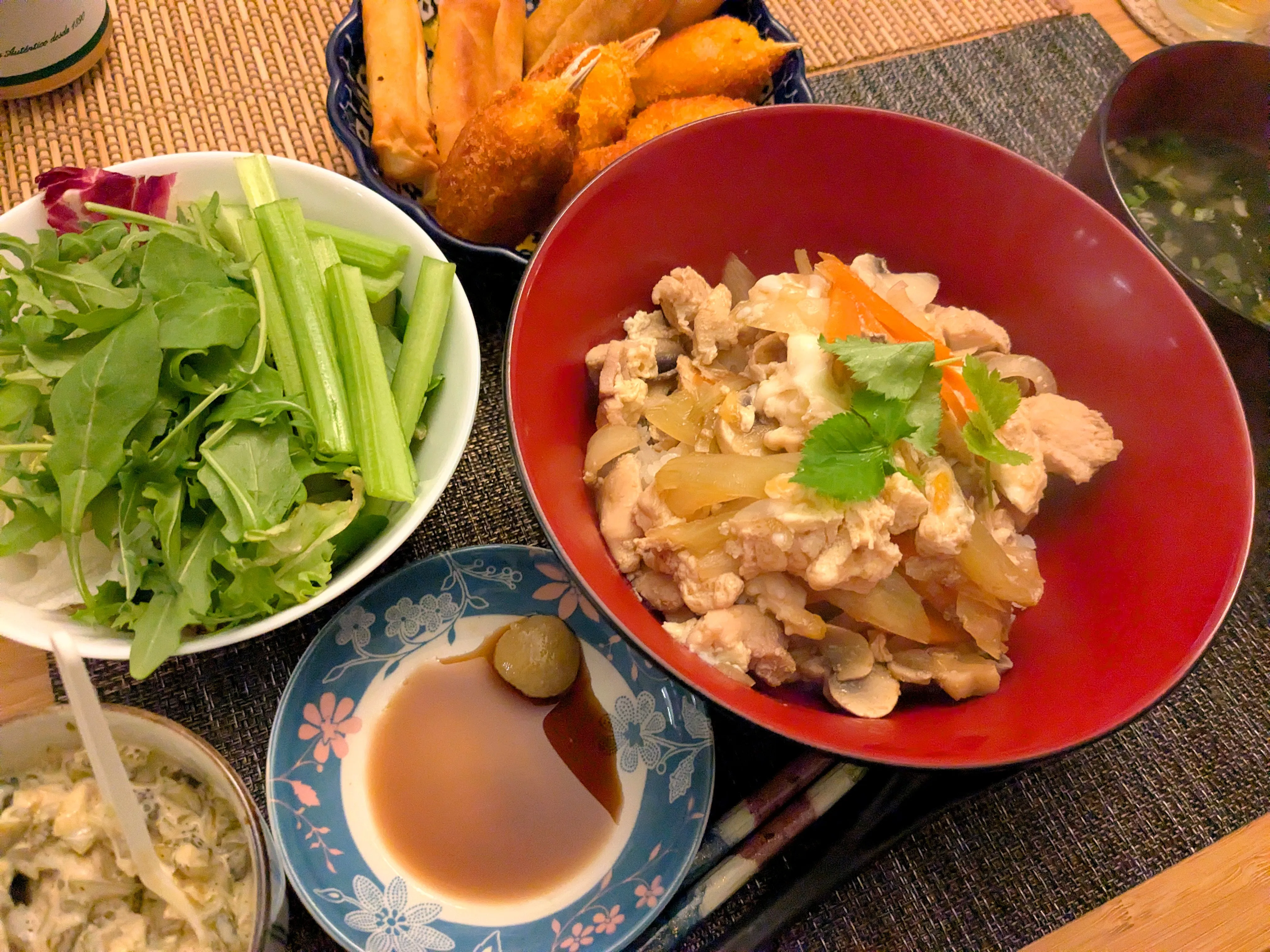 鶏ひき肉のピリ辛親子丼で晩御飯