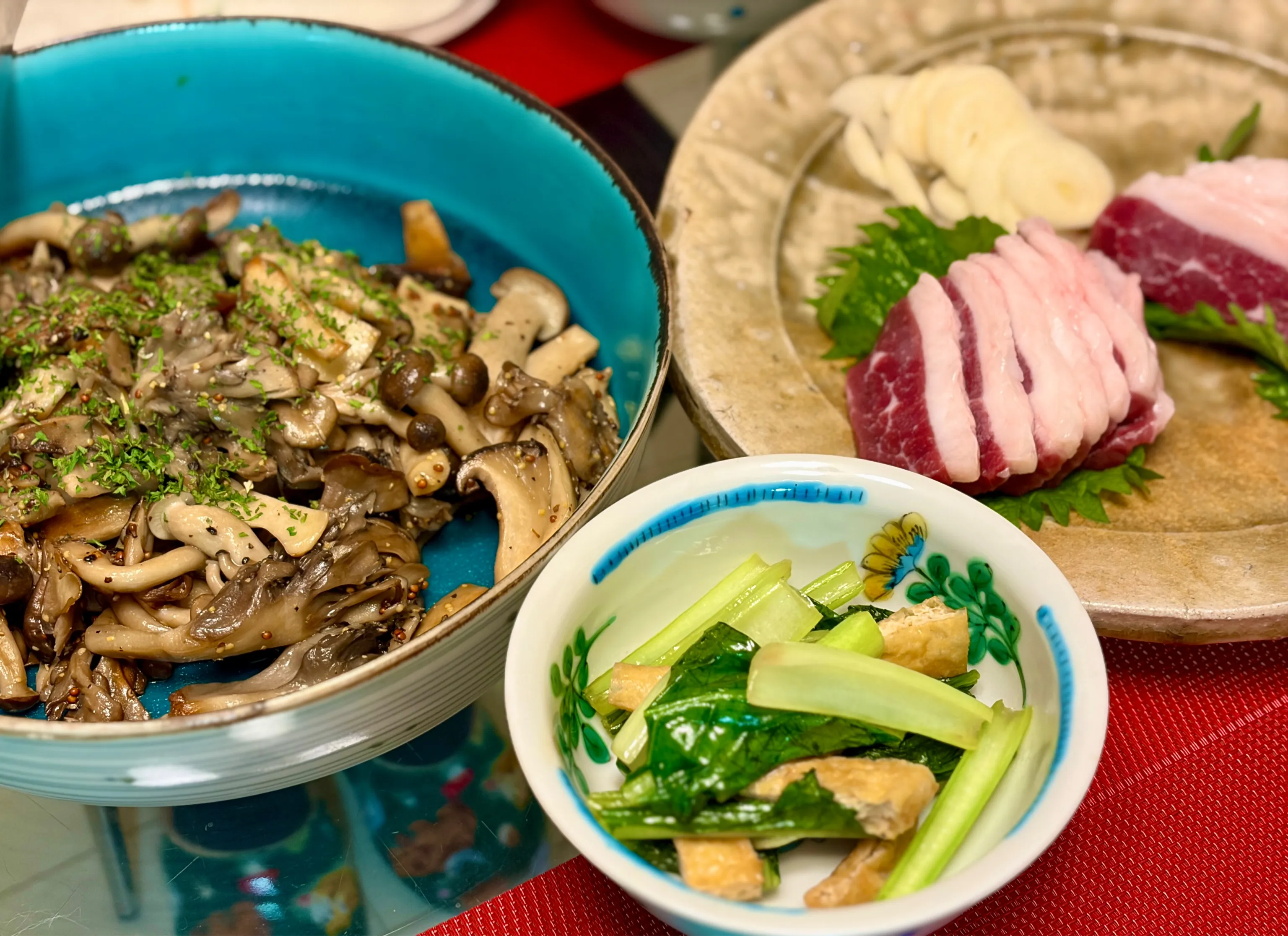 そして、キノコをいろいろ買って雑菌マリネ、あとは小松菜と油揚げを炊いてみました。