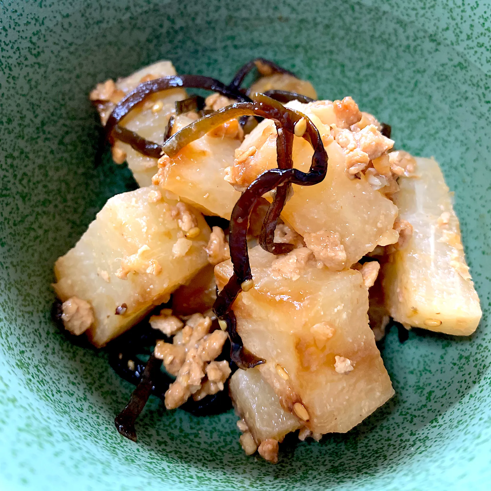 大豆のお肉は味がたんぱくなので、香りのあるきのこ、みそや昆布でおいしくなりました。