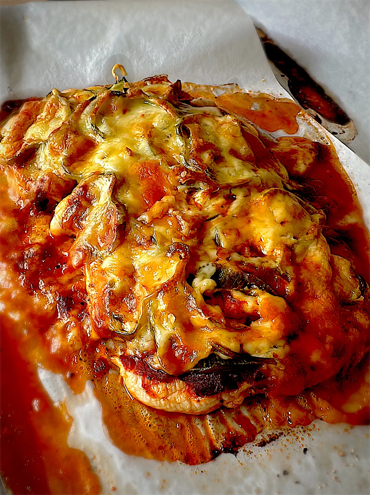 クッキングシートに乗せて、ピザソース、スライスピーマン、ある野菜、チーズ🧀を乗せてオーブンで焼く