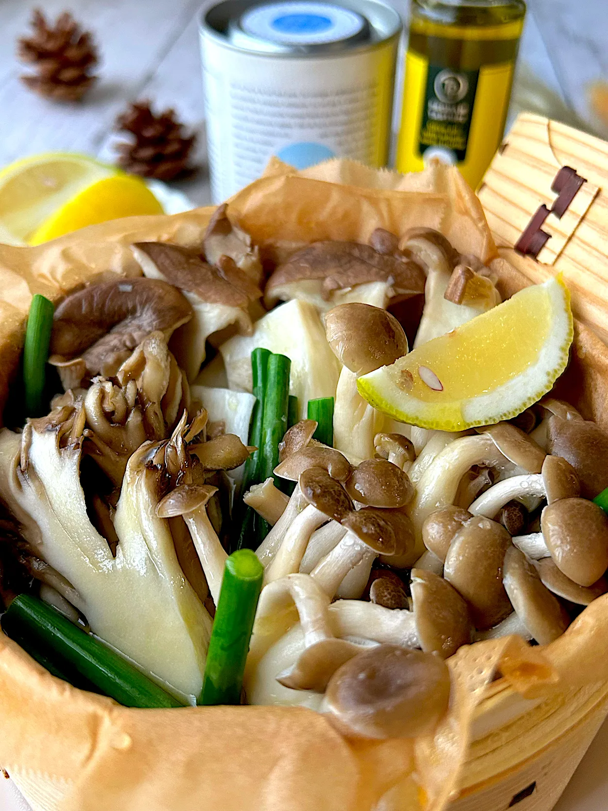 ①蒸籠にクッキングシートを敷いて、きのこ類とニンニクの芽をいれ、マヨルカ島の塩を振りかけ、オリーブオイルをひと回しかける。