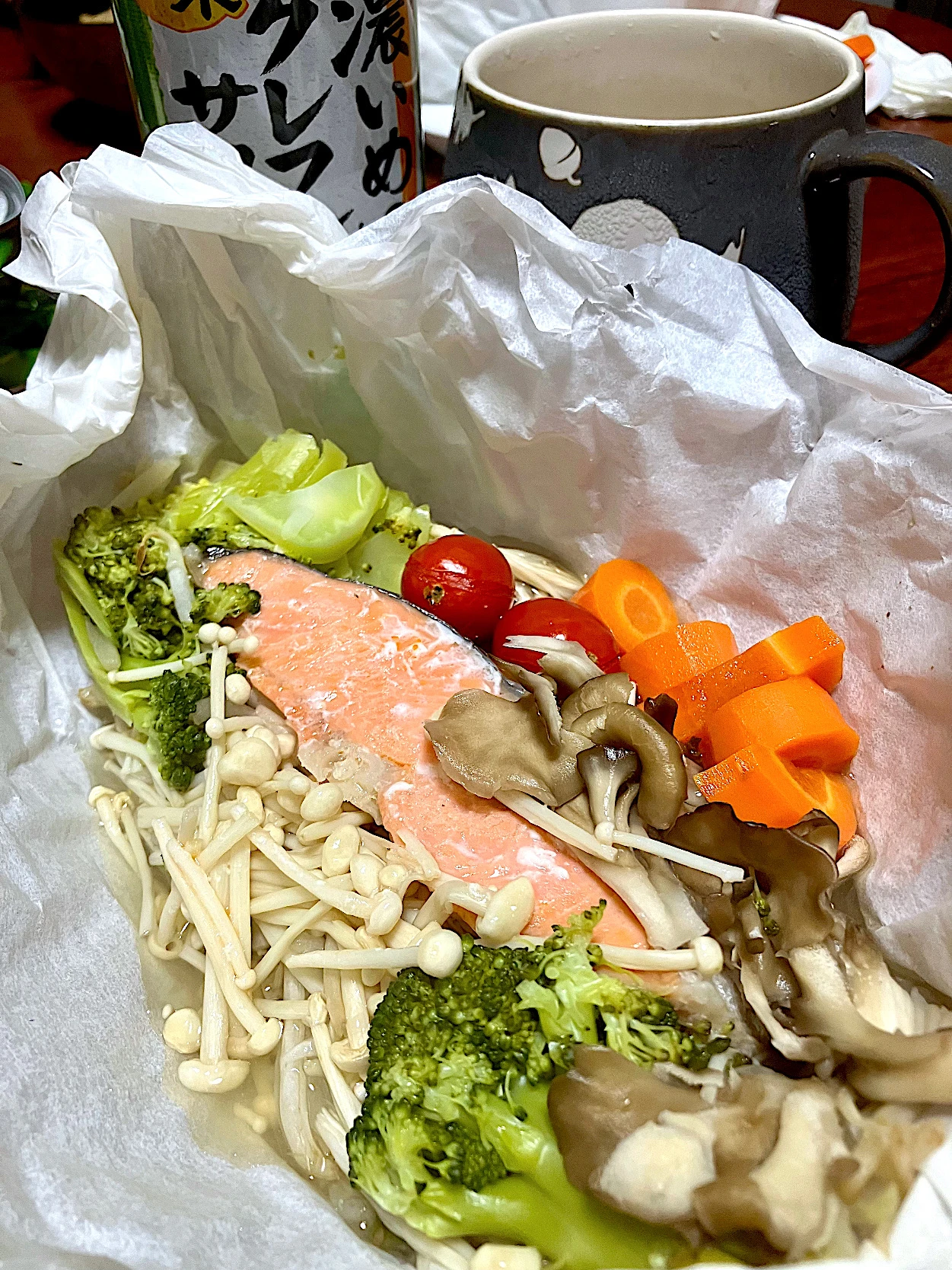 玉ねぎ、榎茸、舞茸、プロッコリー、プチトマト、シャケ、にんじん