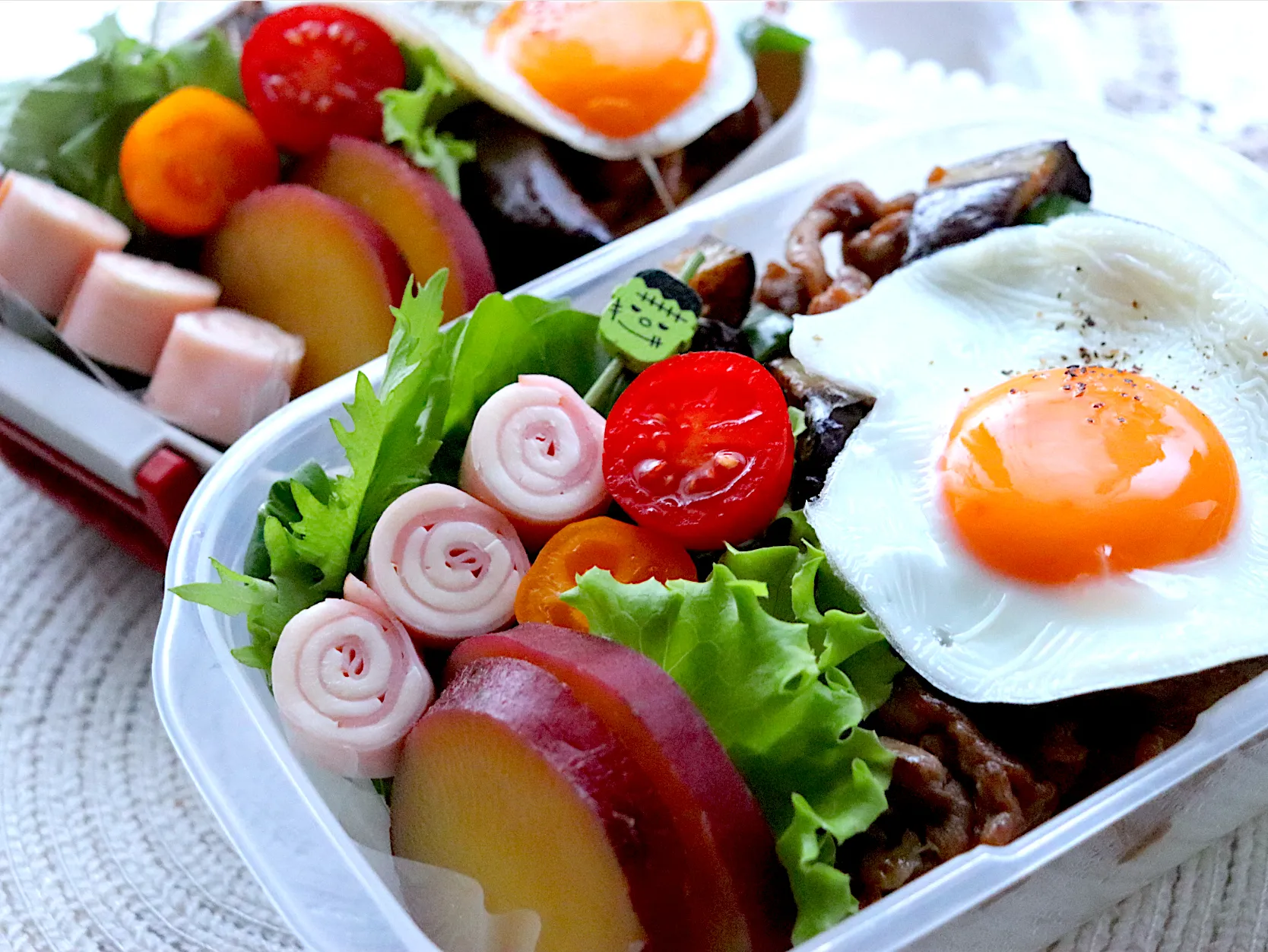 豚と茄子とピーマン味噌炒め、目玉焼き、さつま芋レモン煮、クルクルハムチーズ、野菜サラダ