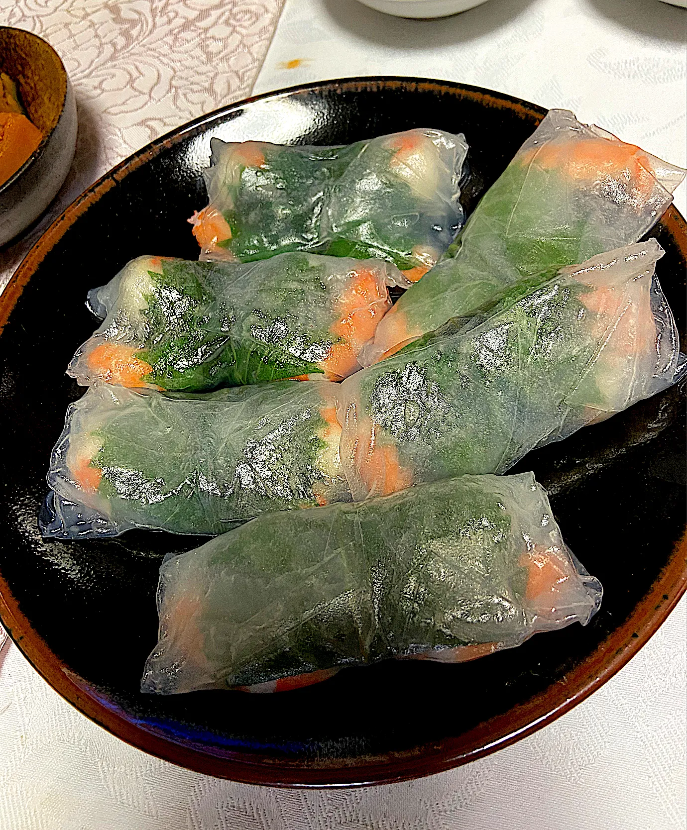 ライスペーパーでシソと茹でエビを巻いただけ。それを沸騰した湯に20秒程度突っ込むと、ライスペーパーがモチツルで旨旨。シラチャーとかナンプラーでいただきます。