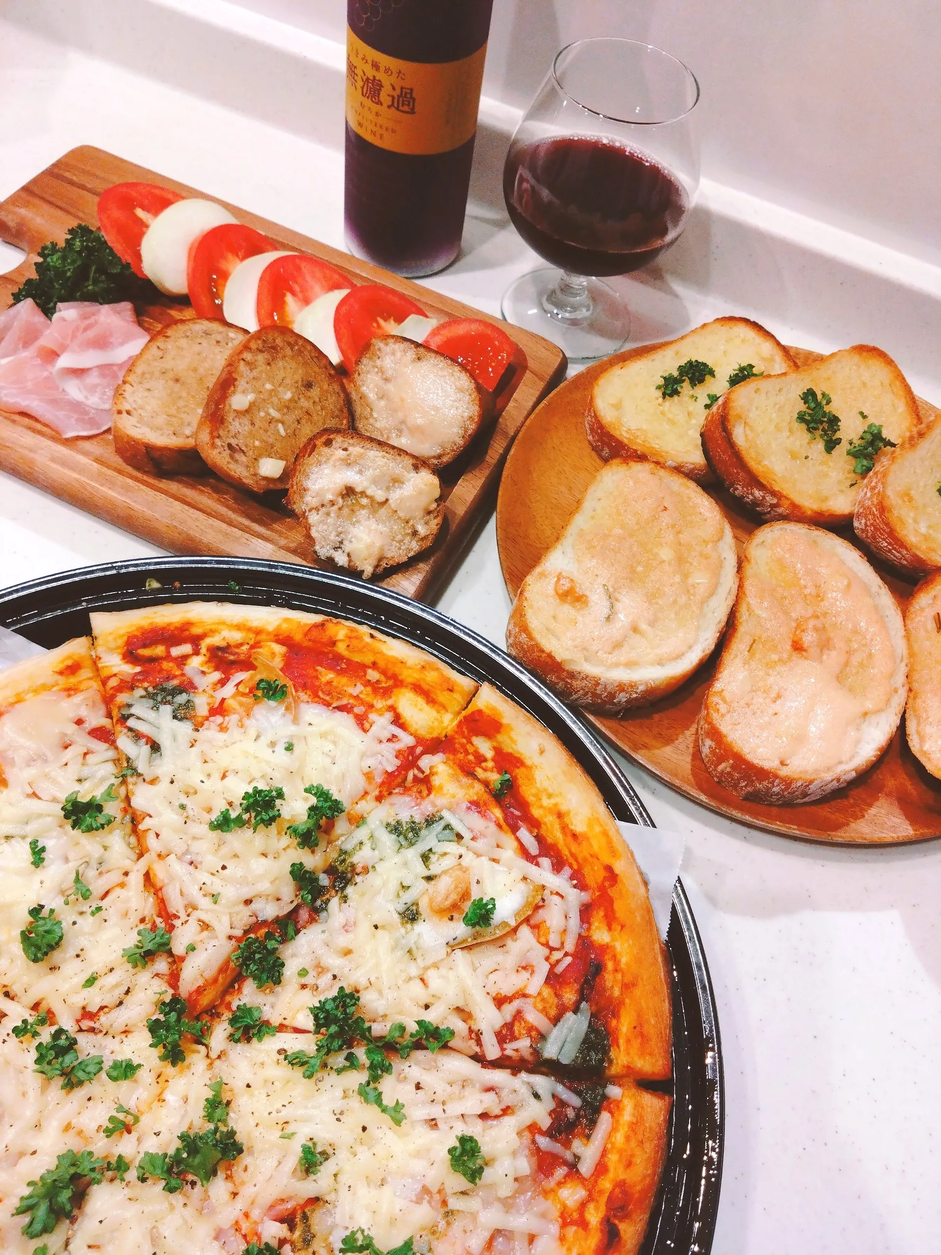 マルゲリータピザ、明太フランス、ガーリックフランス、カプレーゼ