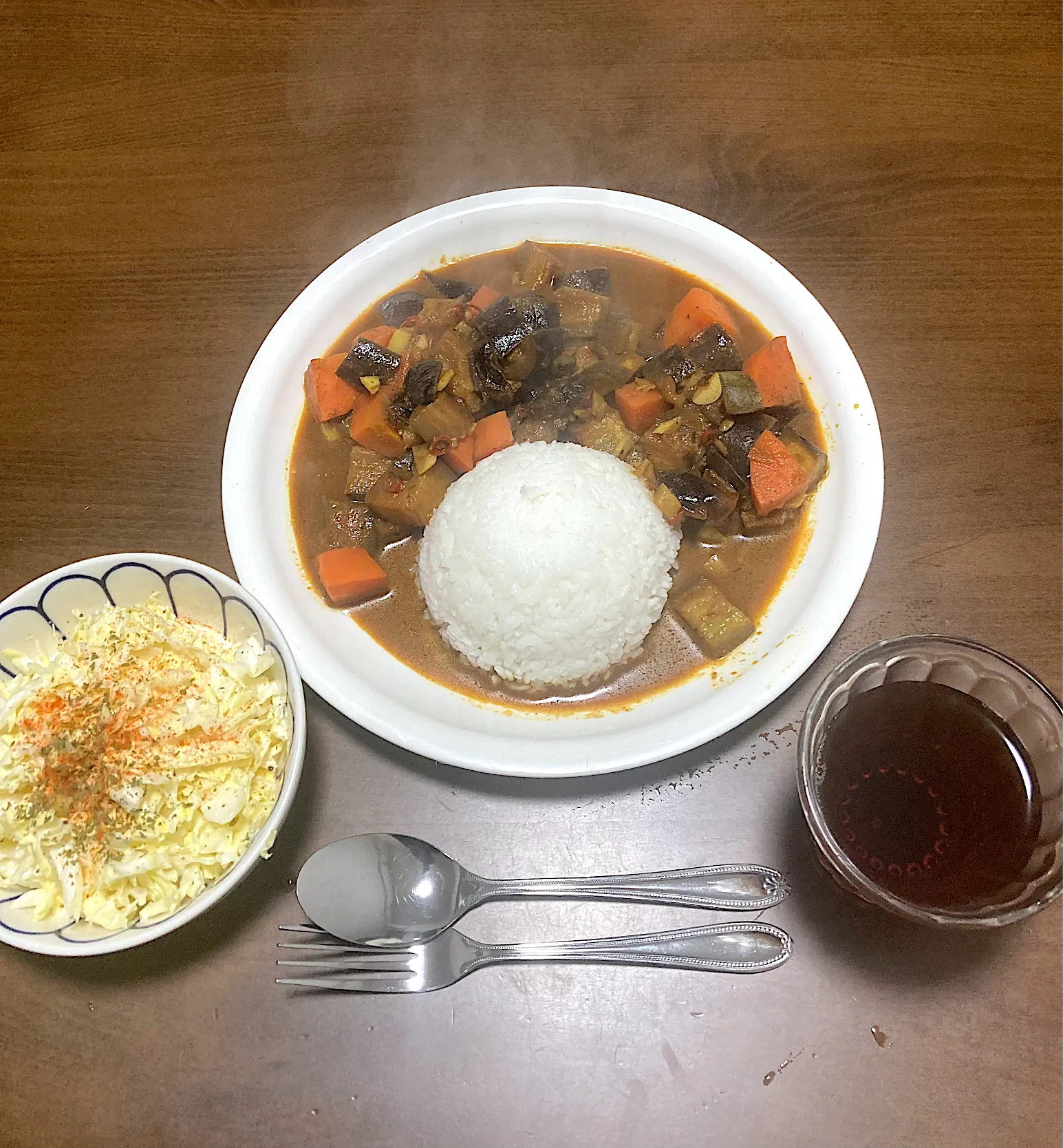 今日の晩ご飯 MDHのサブジマサラを使った茄子と人参のビーガンサブジ、コールスロー。今日も冷蔵庫と食材棚にあるものだけで作った節約メニューです。