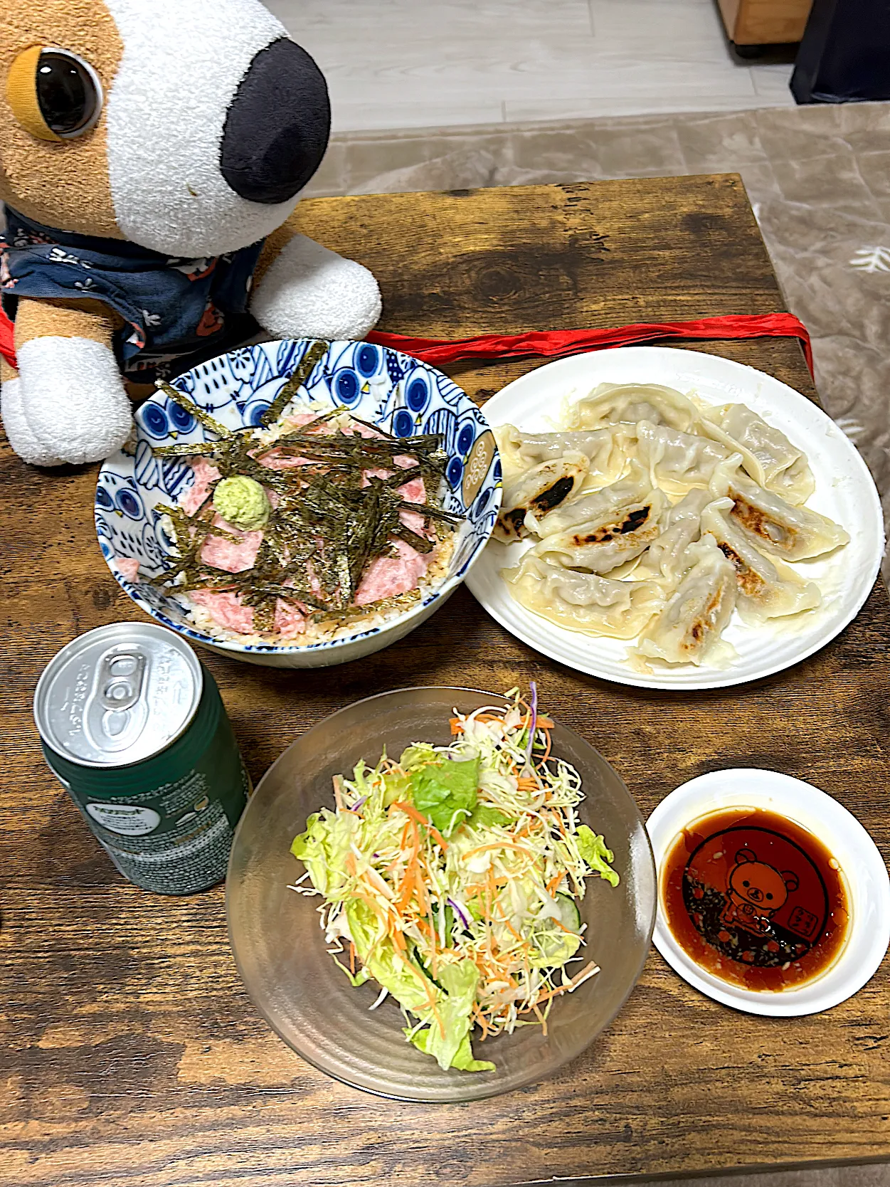 #餃子 #まぐろたたき丼 #サラダ #男子大学生 #人形 #一人暮らし
