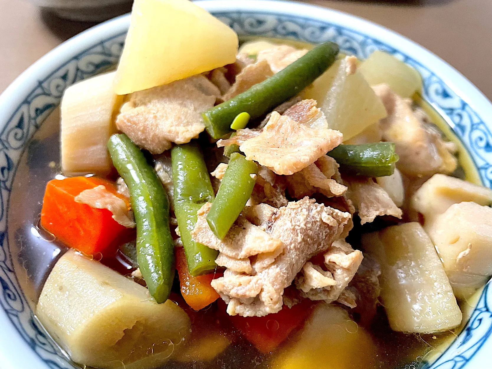 今晩は、業務スーパーで買った冷凍和風野菜を使って、豚肉を加え筑前煮にしてみました🎶 ではいただきます😋