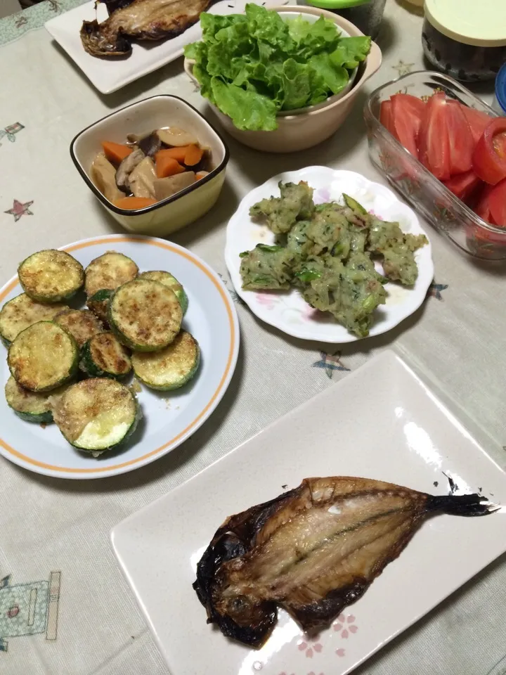 #うちのごはん アジの干物。ズッキーニ。アスパラ入りのつまみ挙げ。