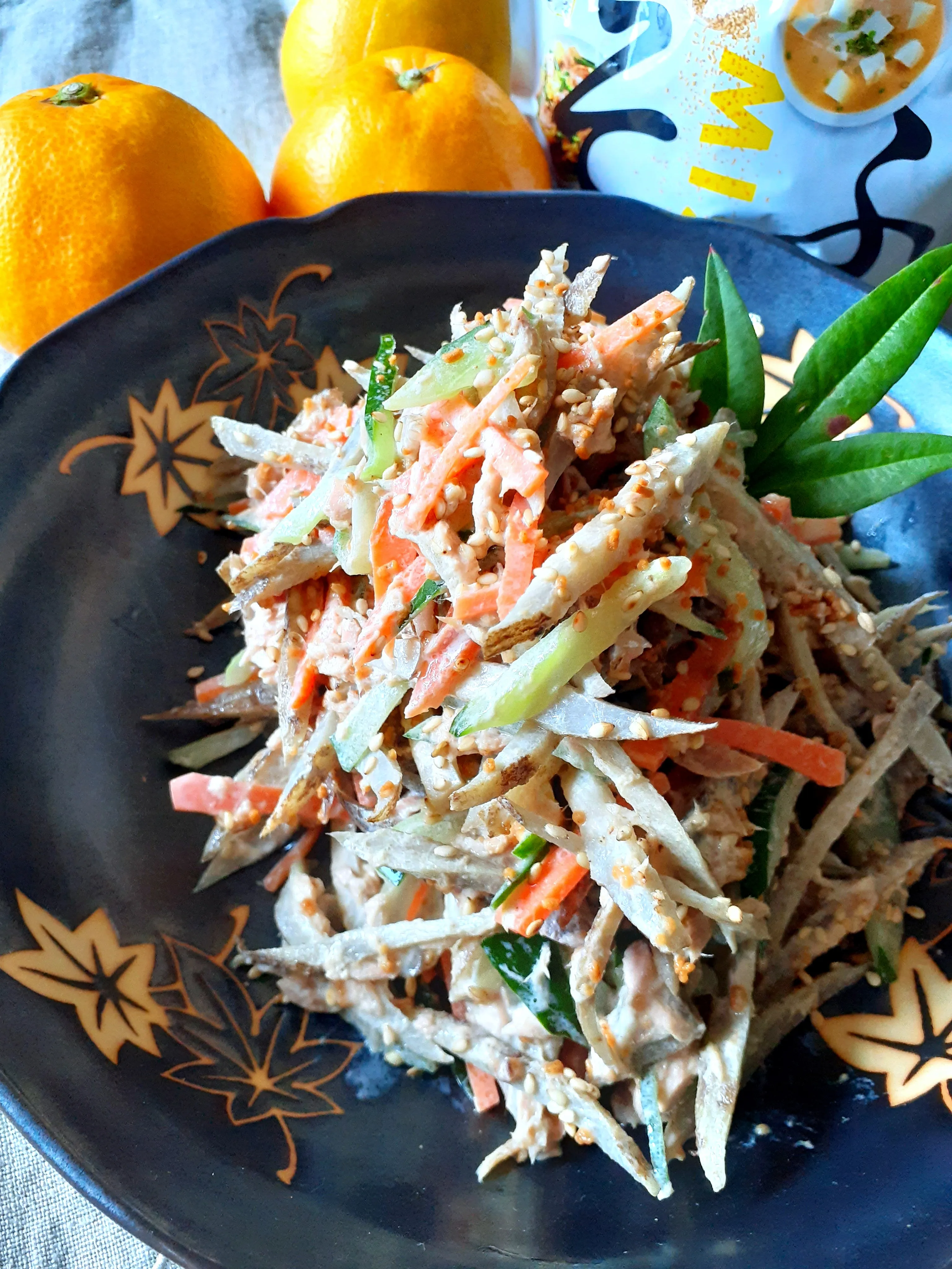 ごぼう、人参、きゅうりにツナ缶シャキシャキな歯触りにツナの旨み、つぶみそでアクセント♡