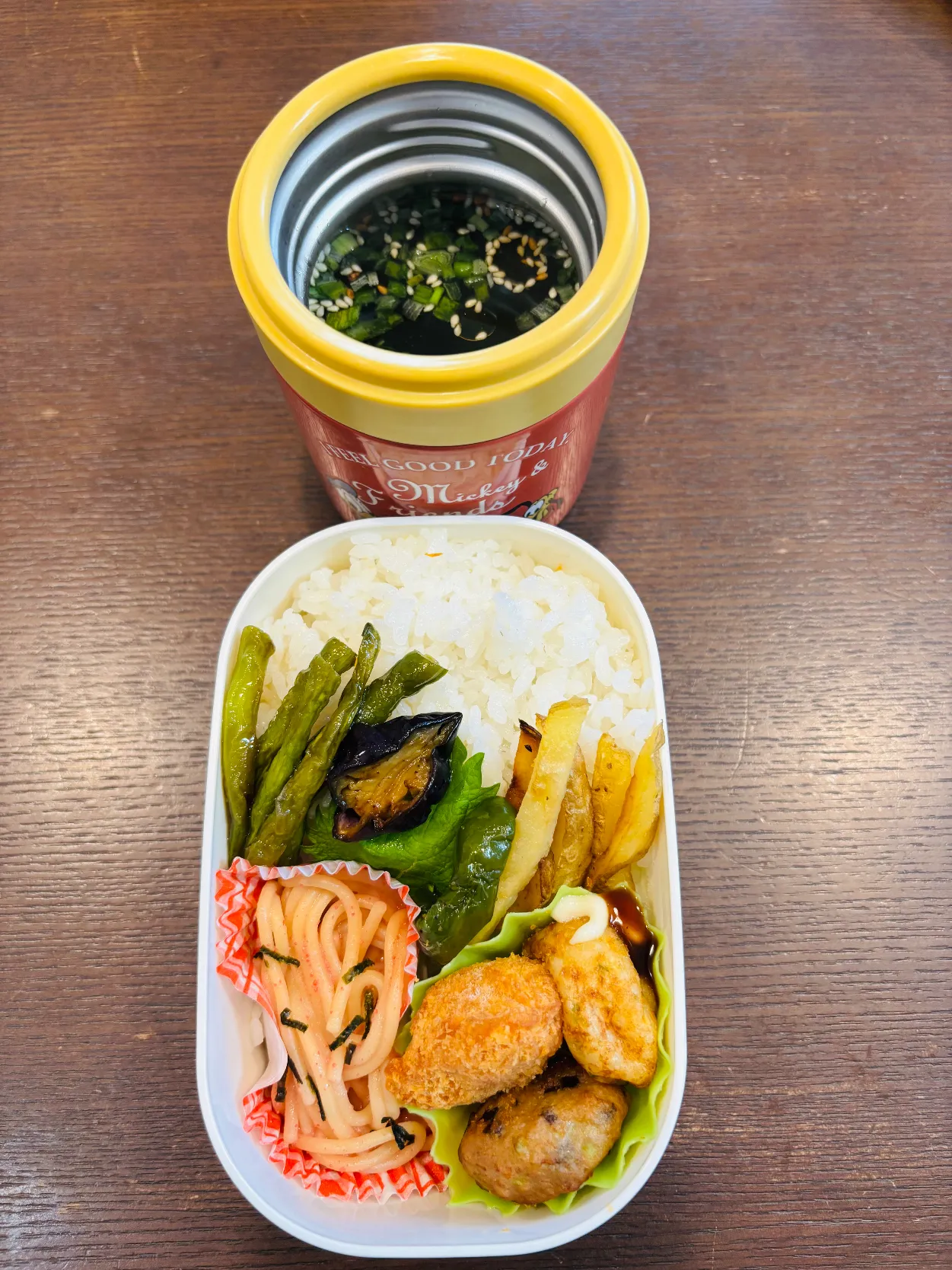 ポテト、いんげんの揚げ浸し、とんかつ、たこ焼き、五目れんこんもち、ピーマンと茄子、たらこパスタ、ごま塩ご飯、ワカメスープ。