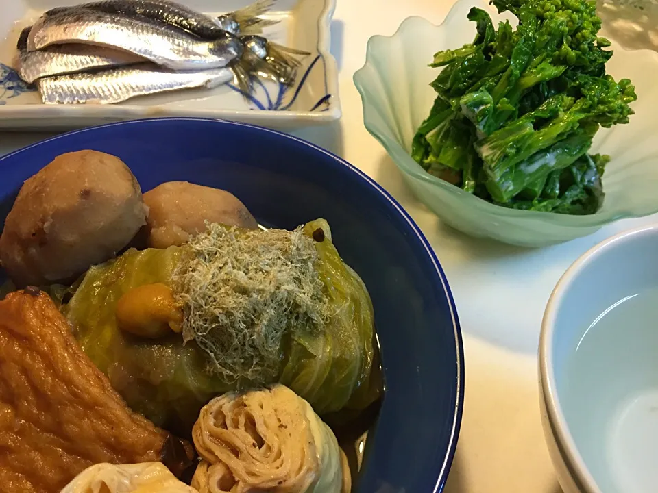 おでんロールキャベツ 菜の花からしマヨネーズ 〆イワシ🍶