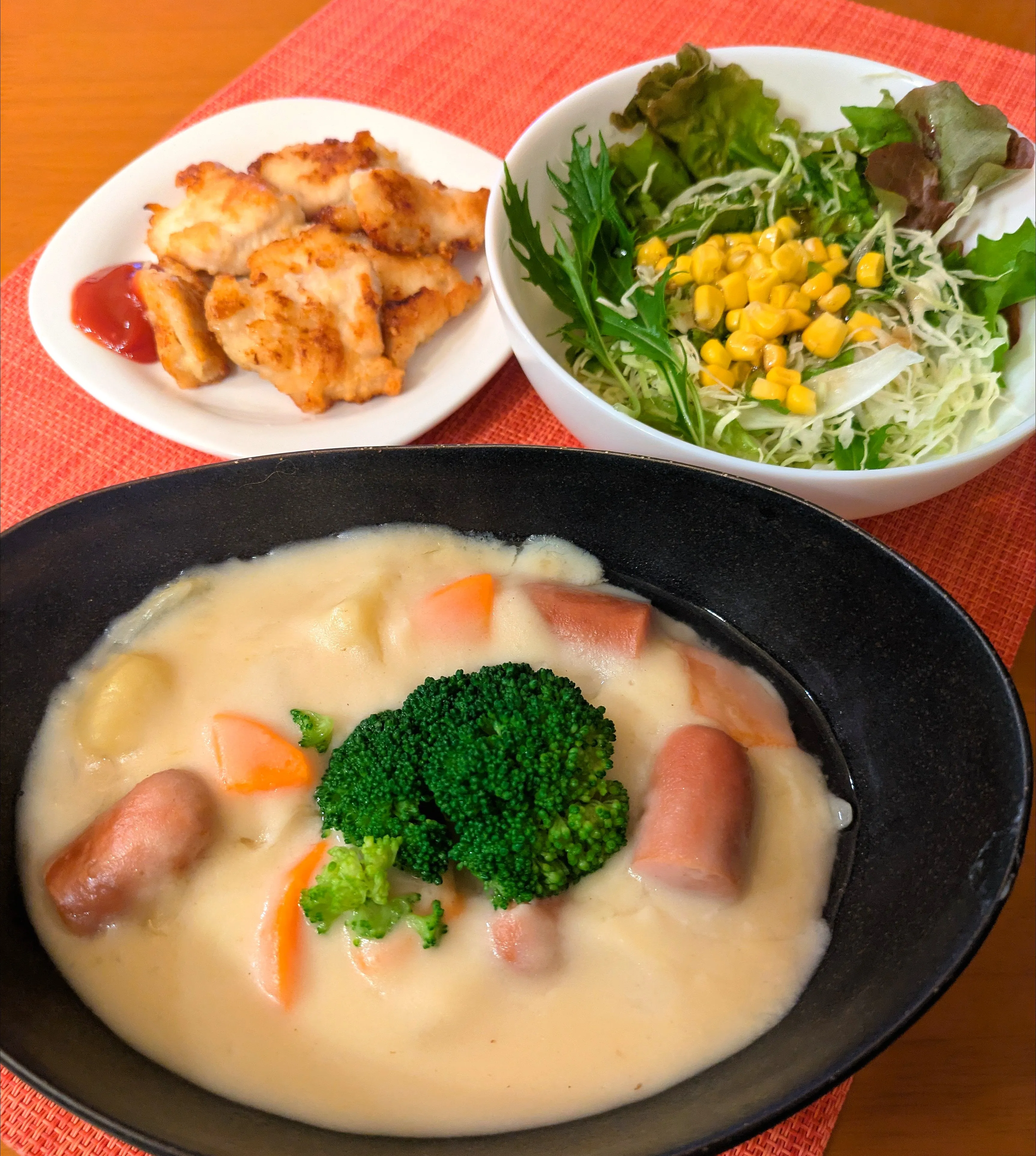 #夕食#クリームシチュー#野菜サラダ#むね肉ピカタ