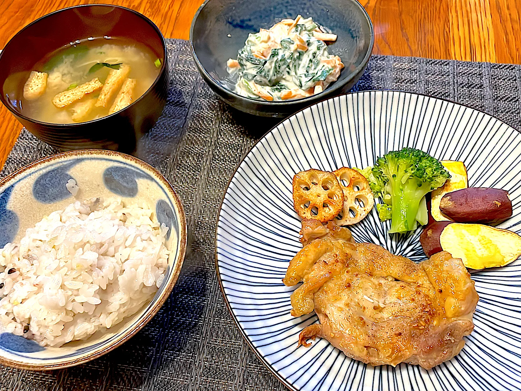 ノンフライヤーで作ったチキンステーキとほうれん草の白和え