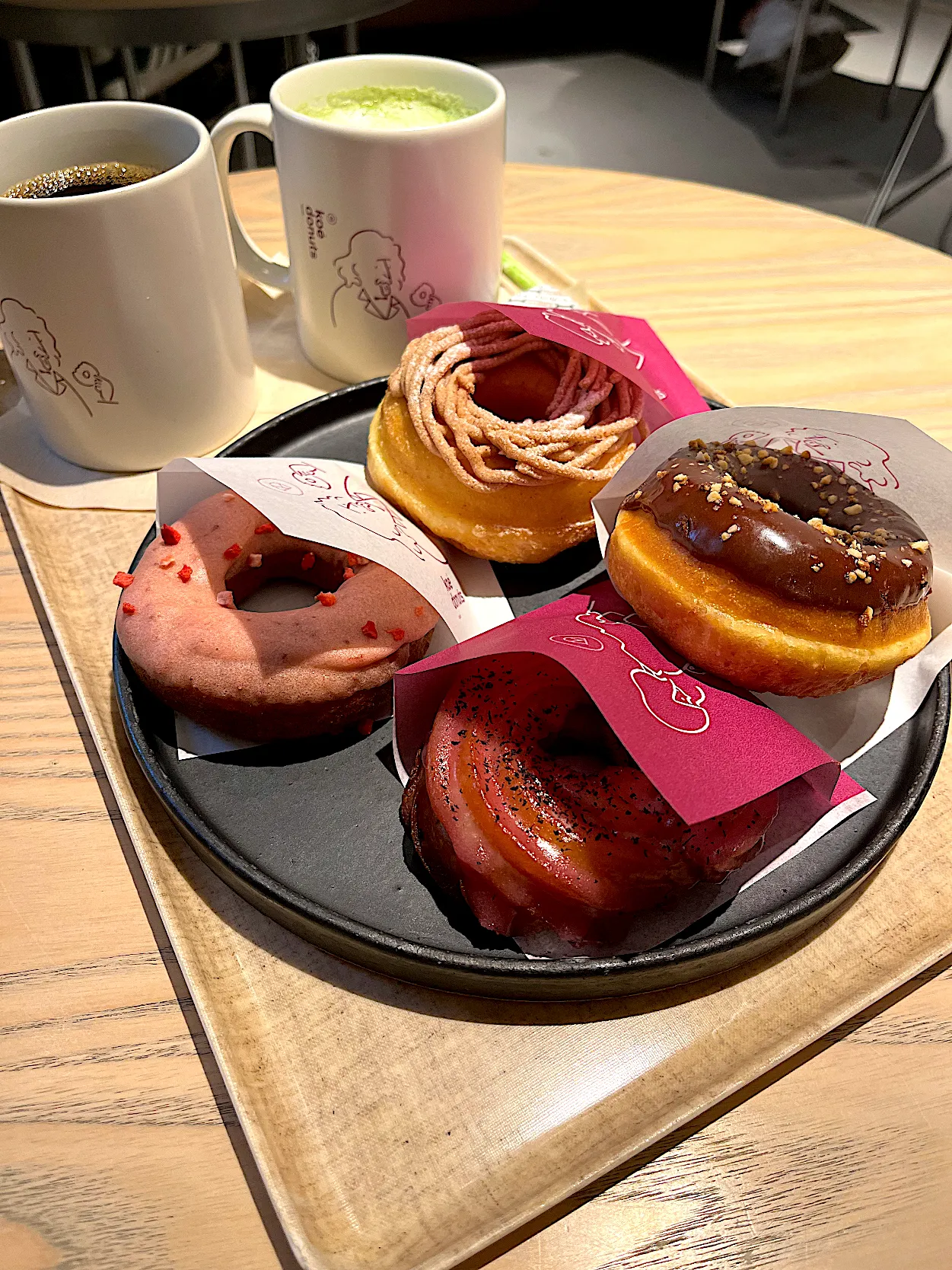 アーモンドキャラメル、赤紫蘇、ストロベリー、和栗モンブラン。ドリンクは抹茶ラテとデカフェコーヒー  #コエドーナツ京都