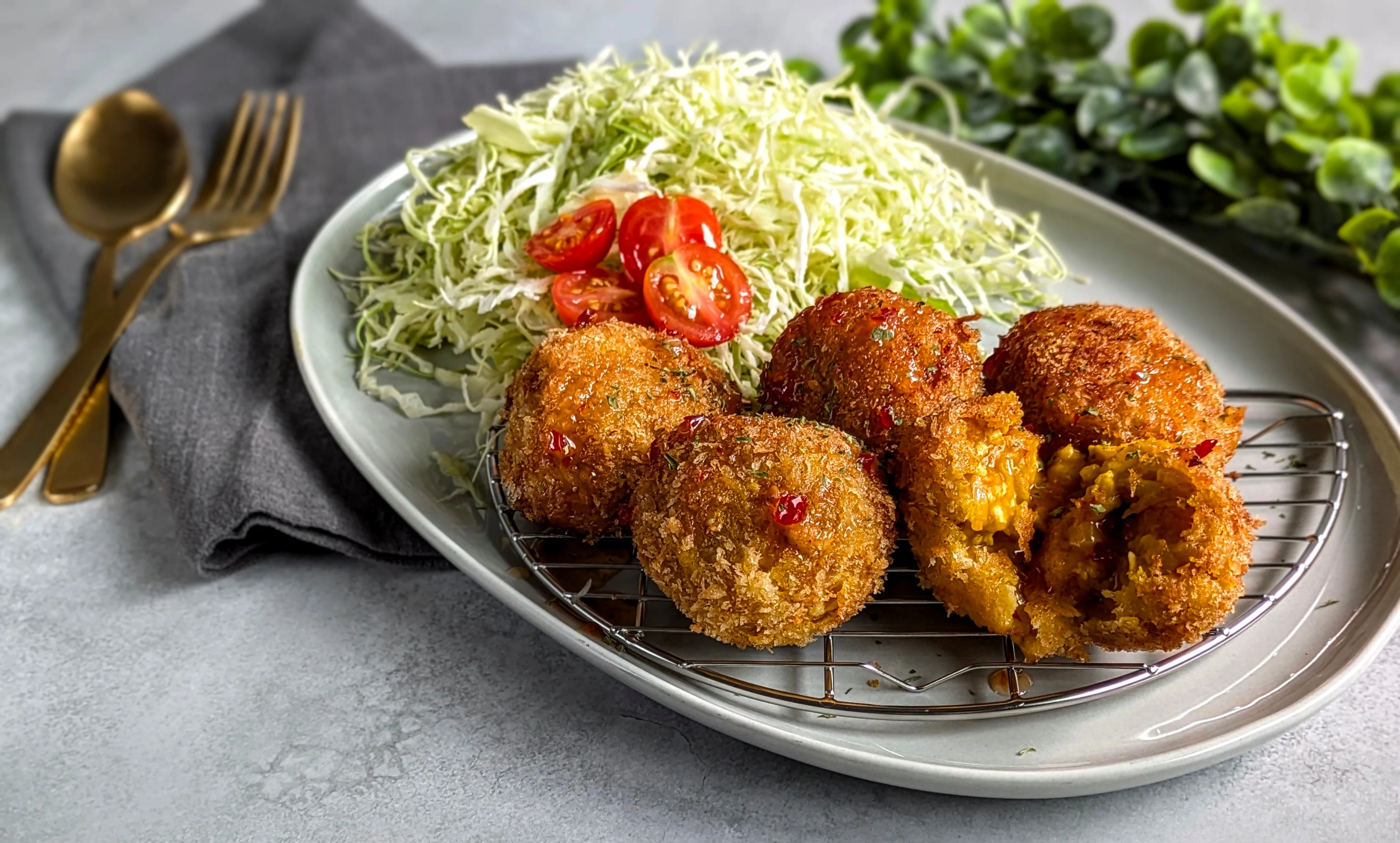 かぼちゃの優しい甘さに、ココナッツミルクのまろやかなコク、そしてカレー粉のスパイシーな香りがクセになる、クリーミーなコロッケです。