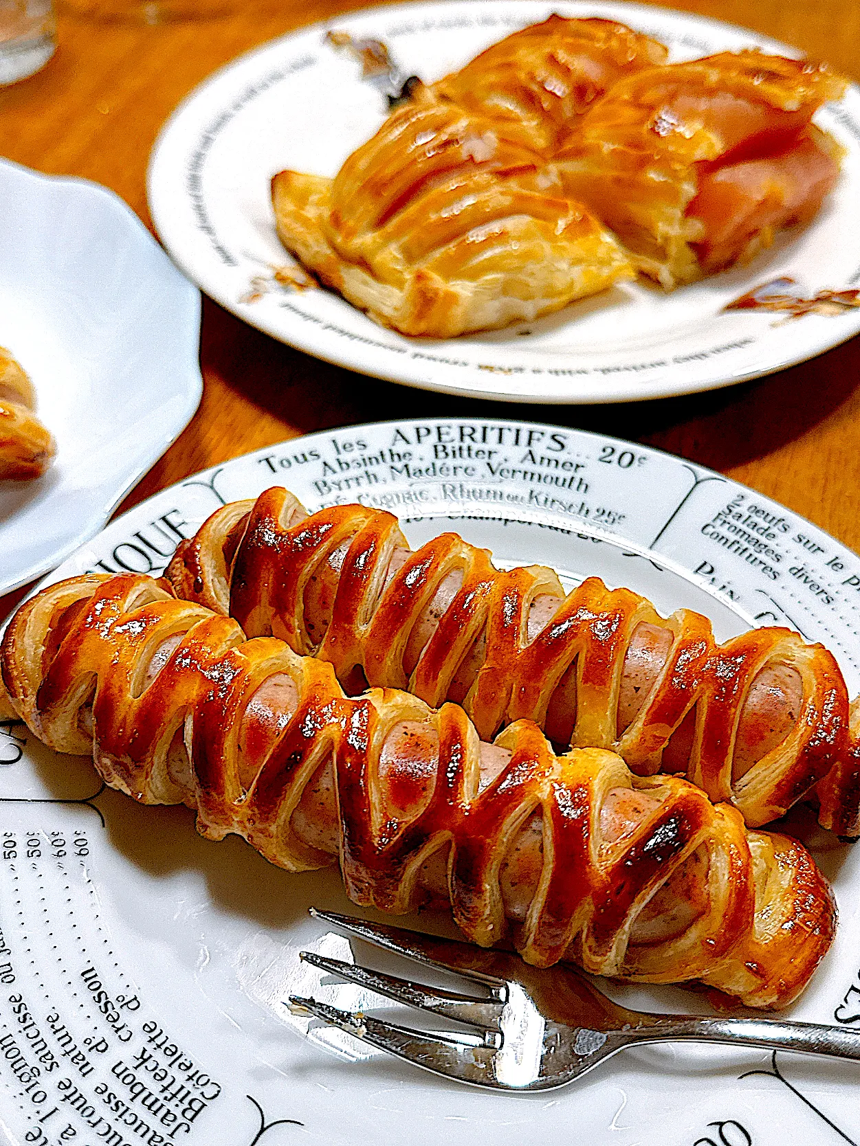 今日は冷凍庫からはみ出たパイシートとソーセージとリンゴのコンポートを使ってパイ二種焼きました。
