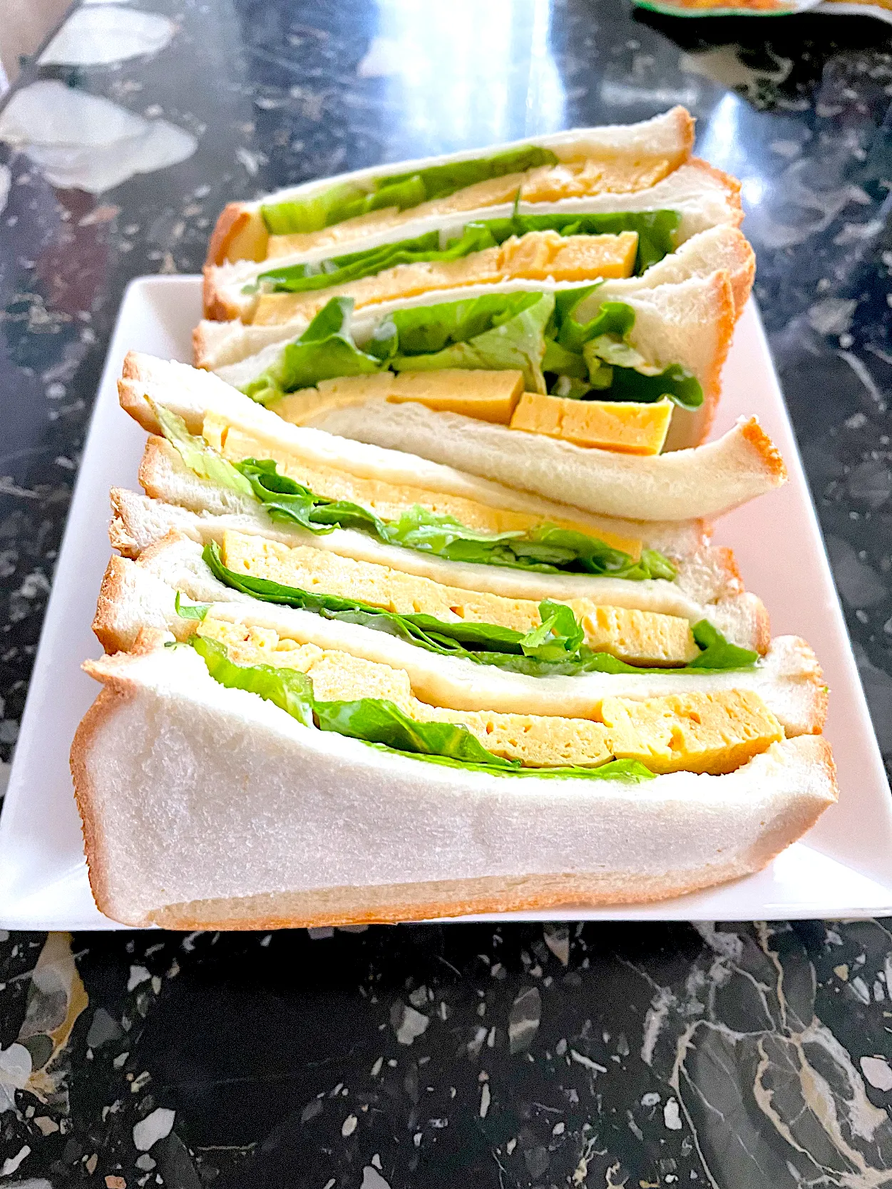 玉子サンドというと、茹で玉子を潰して作る玉子サラダをサンドしたものと、玉子焼きをサンドしたものがありますが、今朝は早起きして出汁巻き玉子を焼き、玉子焼きサンドにしました。玉子焼きは厚めに切り、レタスもサンドしてアクセントにしました。