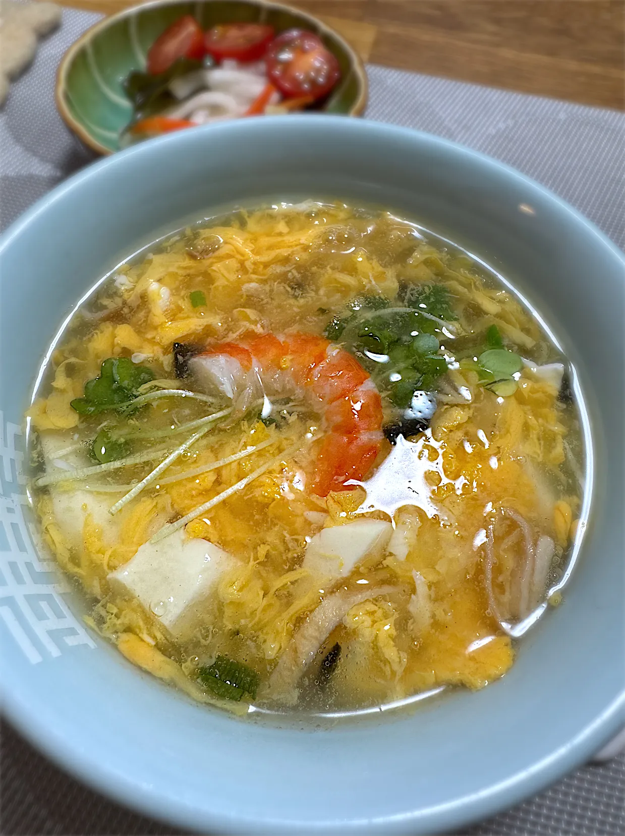お正月のお節に入っていた海老の旨煮が1尾残っていたので殻を剥いて半分にカットして乗せました。今年の海老の旨煮は背ワタの取り除きが甘かったのでこれがちょうどよかったです