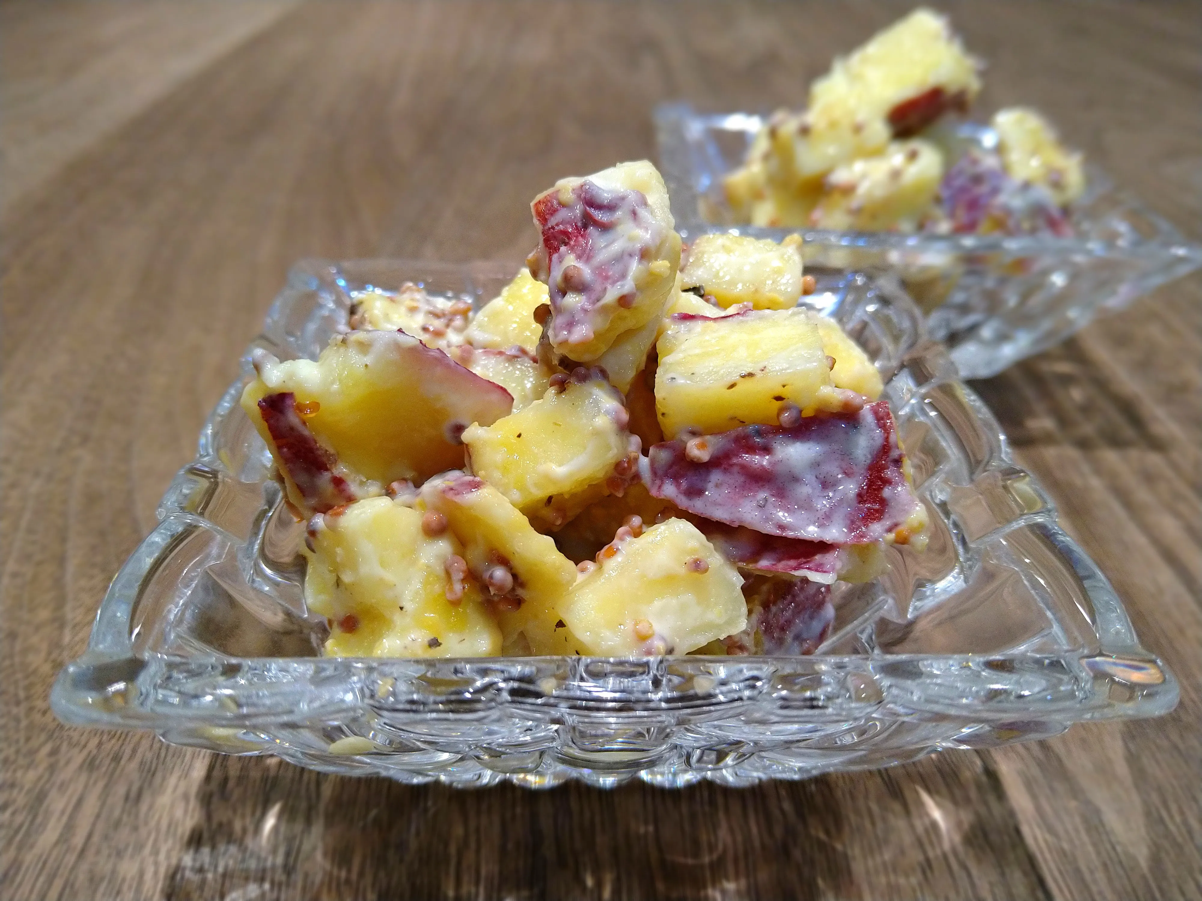 レンジアップしたさつまいもを粒マスタード コンデンスミルクで和えて冷まし マヨネーズで和え 塩 黒胡椒で調えるだけ