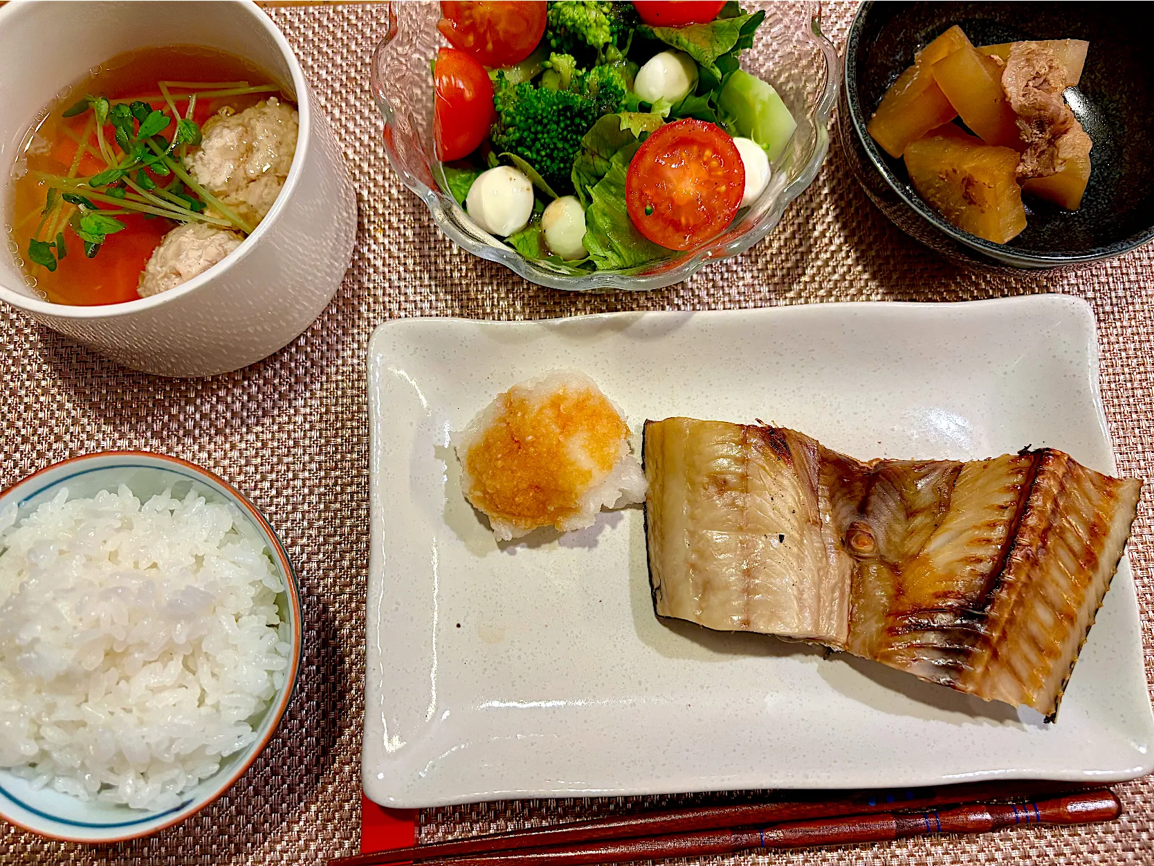 #ホッケ #実家ごはん #豚肉大根 #サラダ #モッツァレラ #鶏団子スープ #一汁三菜