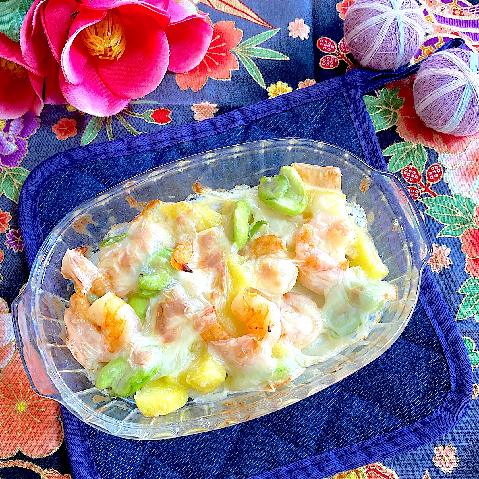 そら豆を見つけたのでエビとポテトグラタン風にしました😄