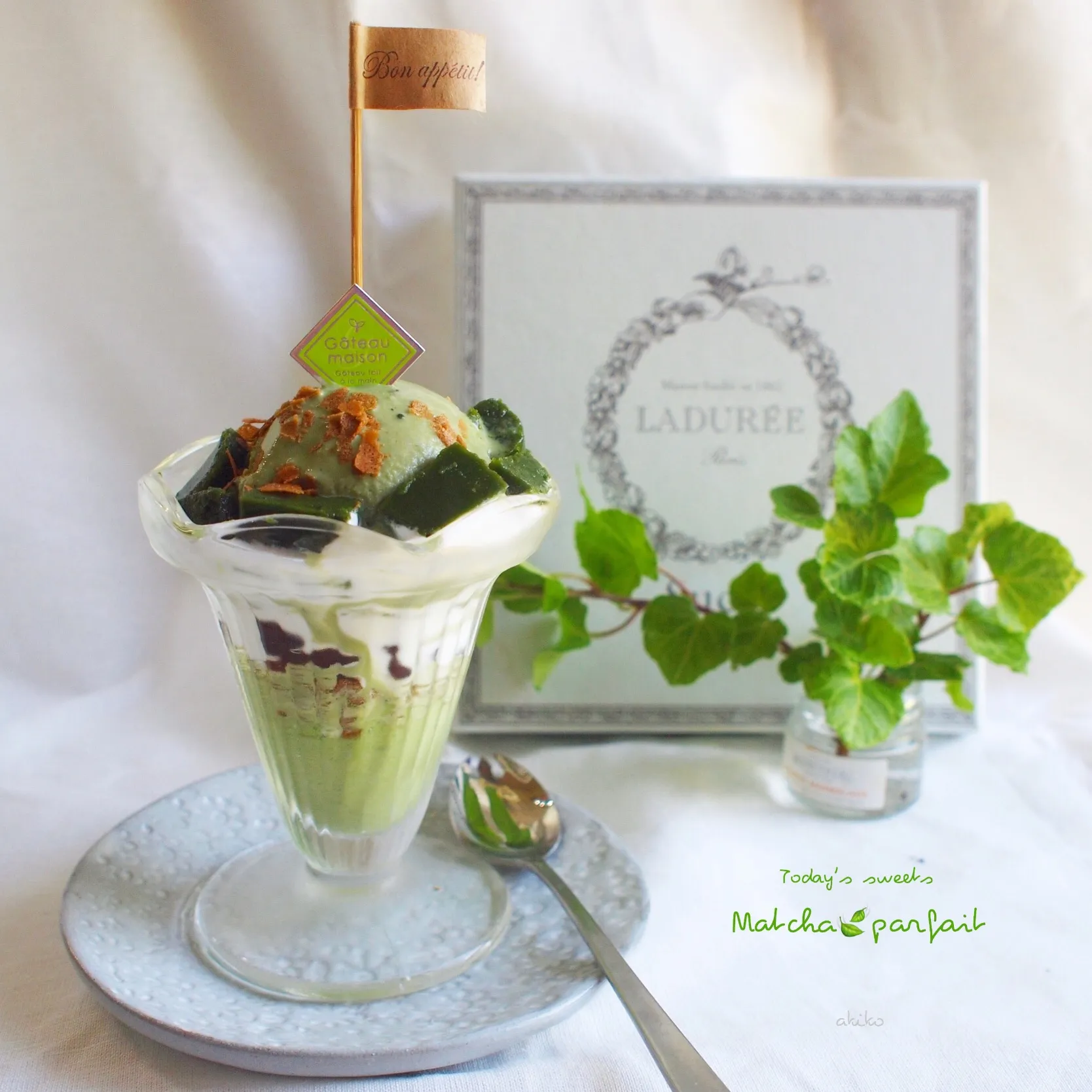 あずき、抹茶ビスキュイ、抹茶アイス、抹茶ゼリーなどなどを積み重ねてます😊