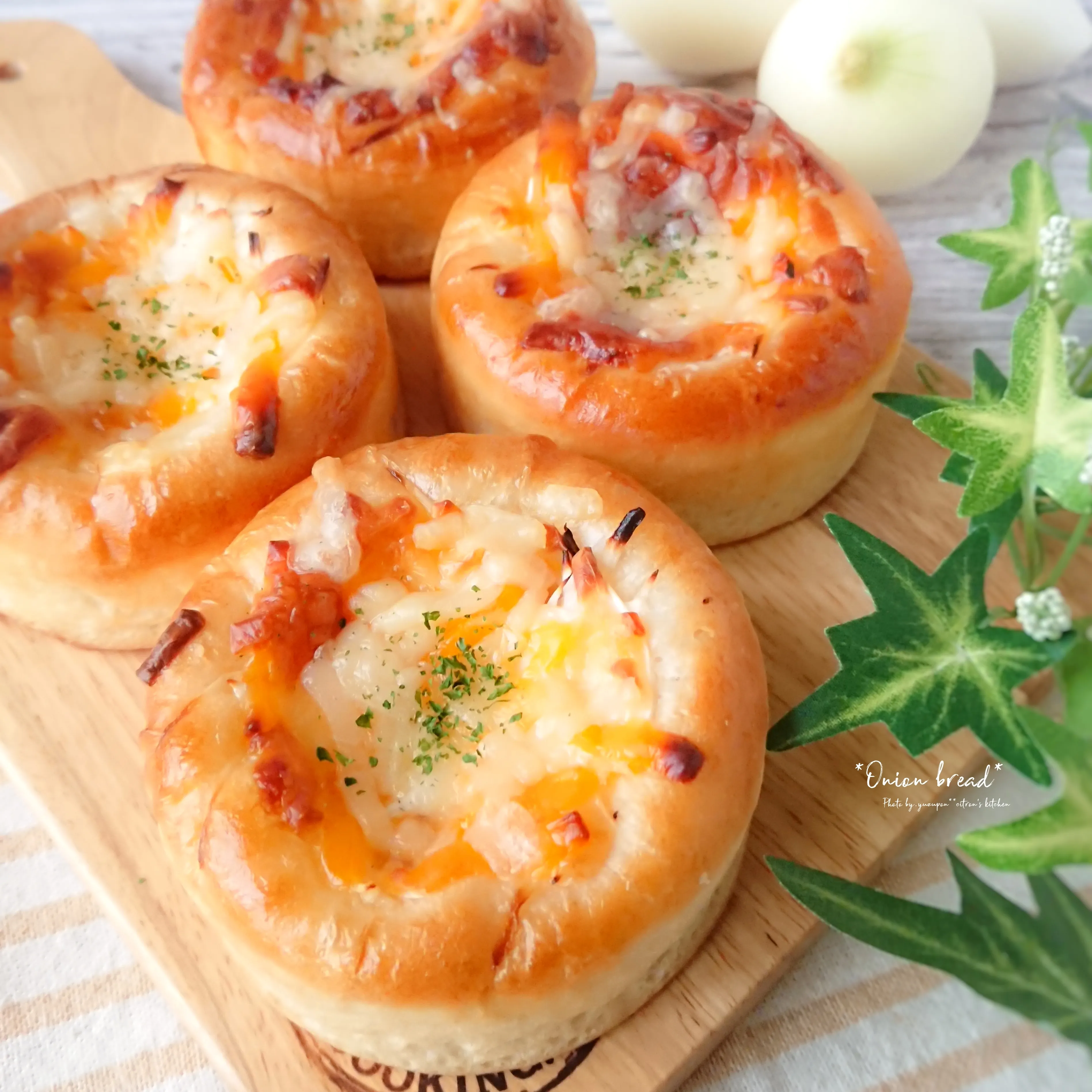 タマネギ+マヨチーズベースを乗せたオニオンブレッド!!最近覚えたパン作りで真似させてもらいたいと思います(再現できるかわかりませんが🤭)