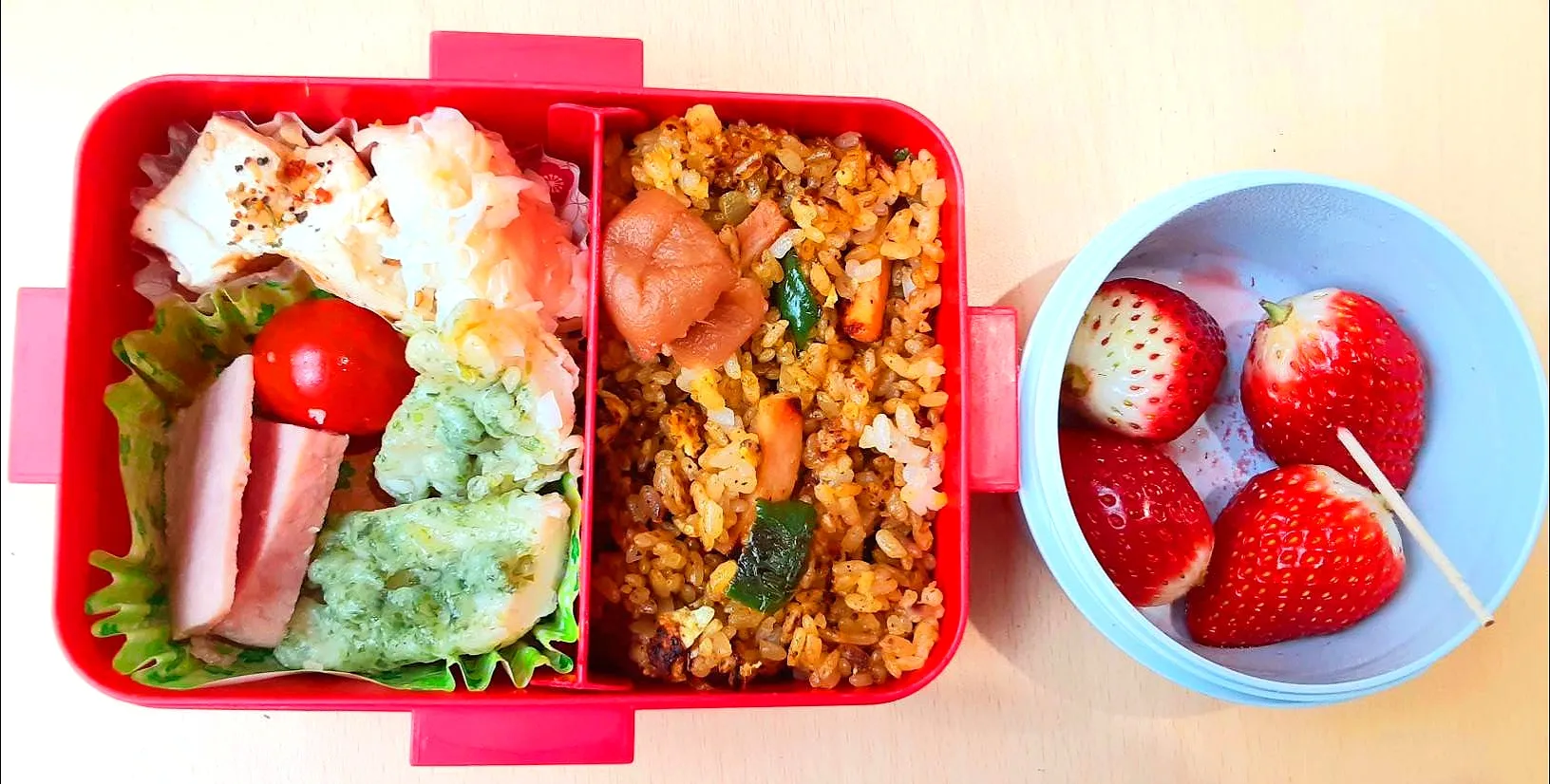 ドライカレー、竹輪の磯辺揚げ、イカ焼売、豆腐ステーキ、ロース蒸しハム