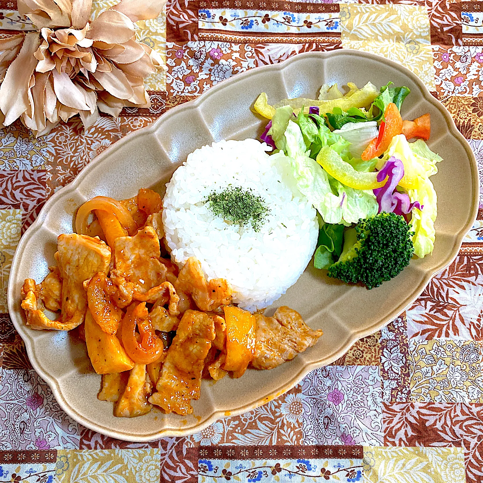 少し厚めで高価な豚肉を野菜とポークチャップ風にしました😄