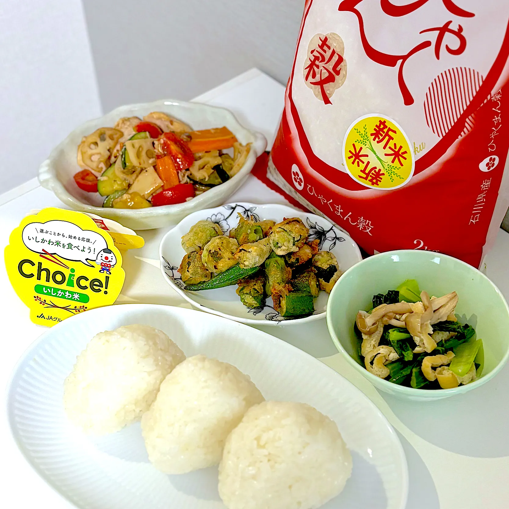 ありがとうございます〜♪ #石川県産米 #ひゃくまん穀 #新米 #いしかわ米 #塩むすび#cuisine_de_yoko #れんこん #ズッキーニ #鶏むね肉 #小松菜 #オクラ唐揚げ #おにぎり/おむすび