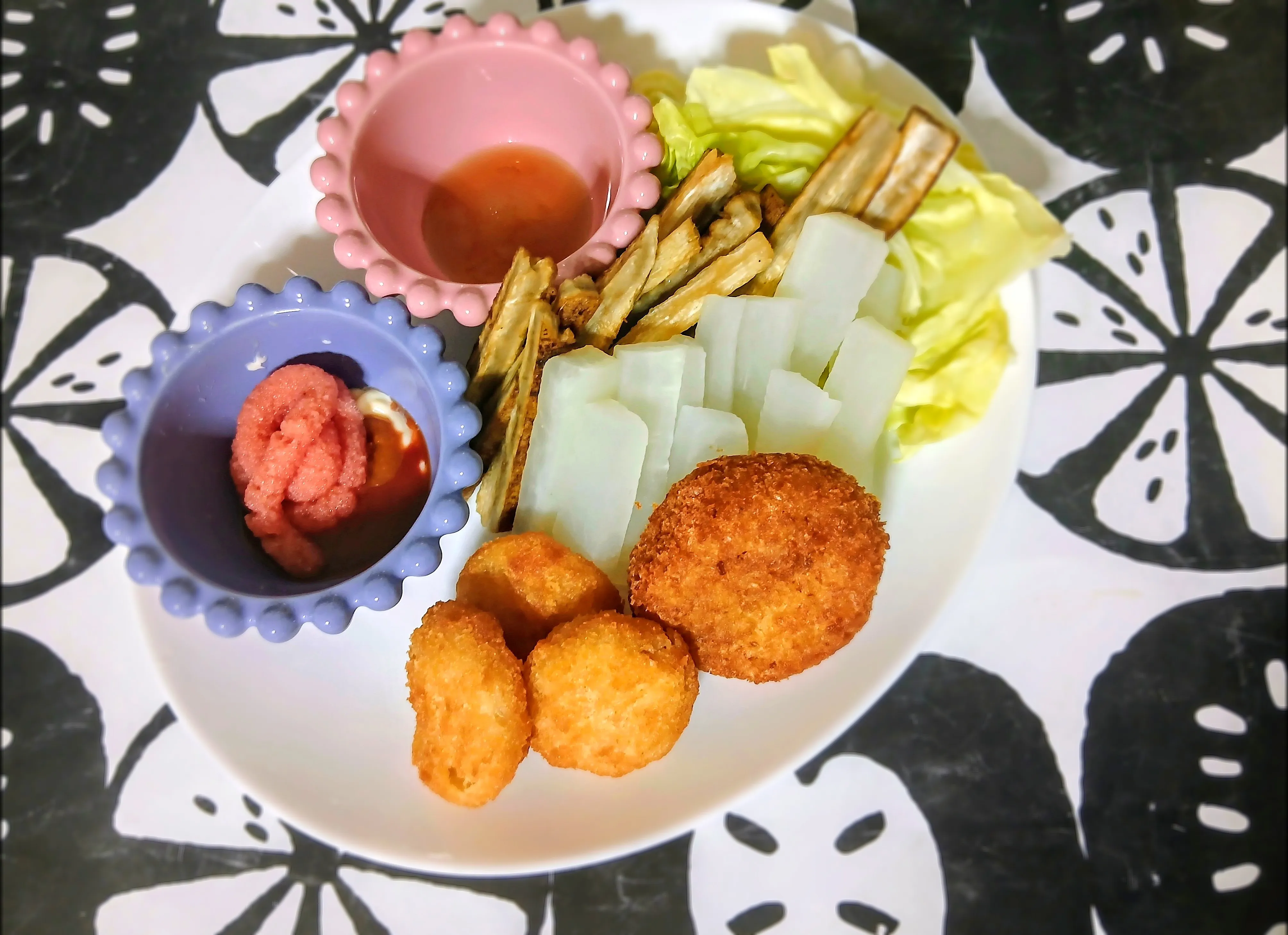 市販のカレーコロッケとササミチキンもこのタレに付けながら食べました😆✨