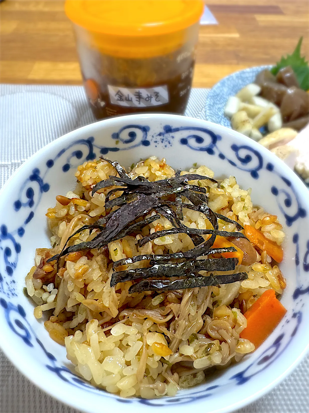 えのきの出汁漬けがあったので具材にしました、なめたけとかでもOK!なければきのこ類+ほんだし小さじ1〜とかで代用できると思います。