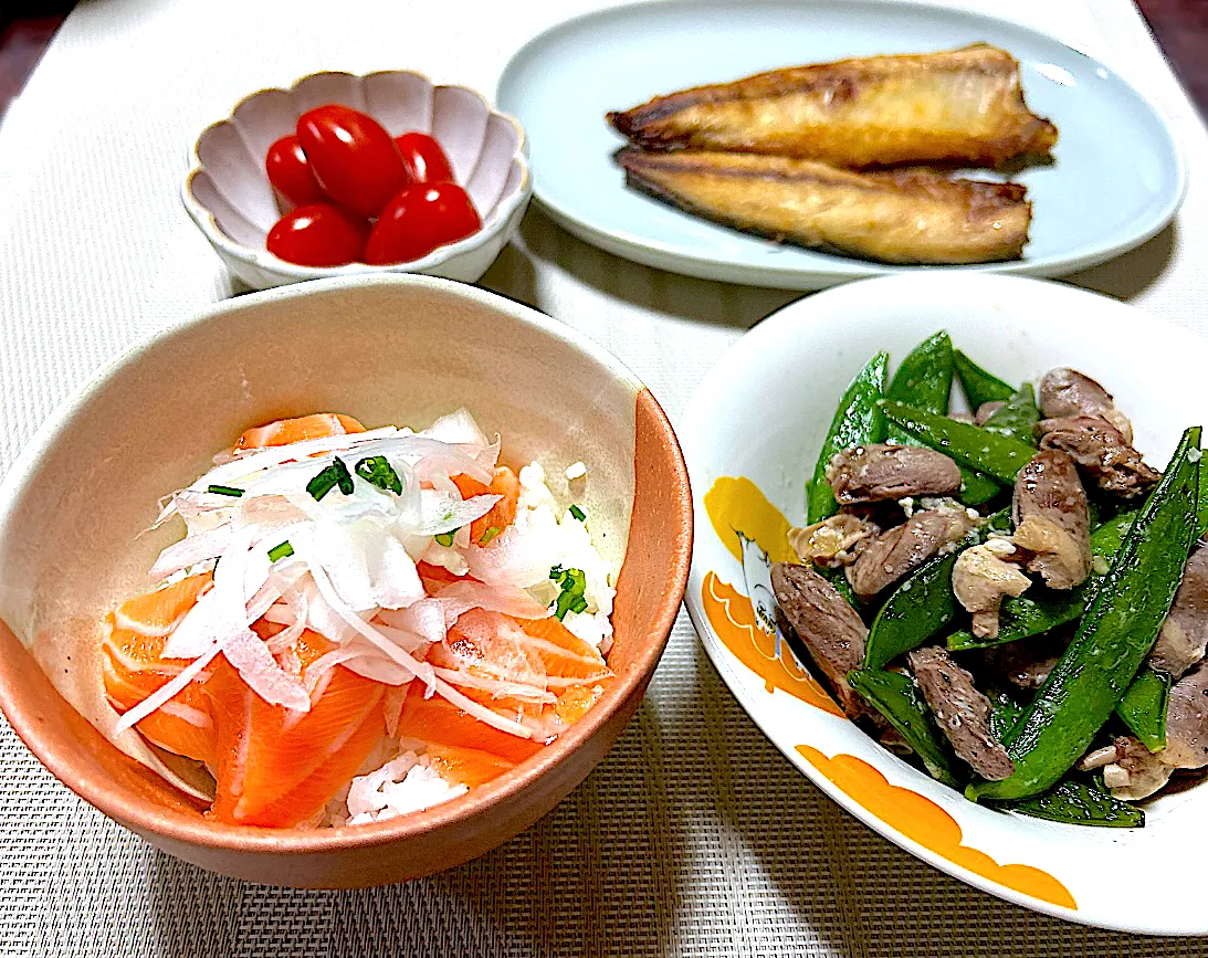 #サーモン丼 #ハツとスナップエンドウの塩麹炒め #焼きサバ #トマト