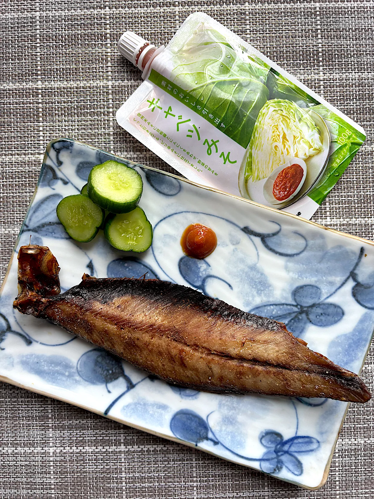 山椒の風味が程良く秋の日本酒にピッタリのニシンの山椒塩焼き。キャベツみそを付ければ、ニシンと良く合い味変でもう一口。