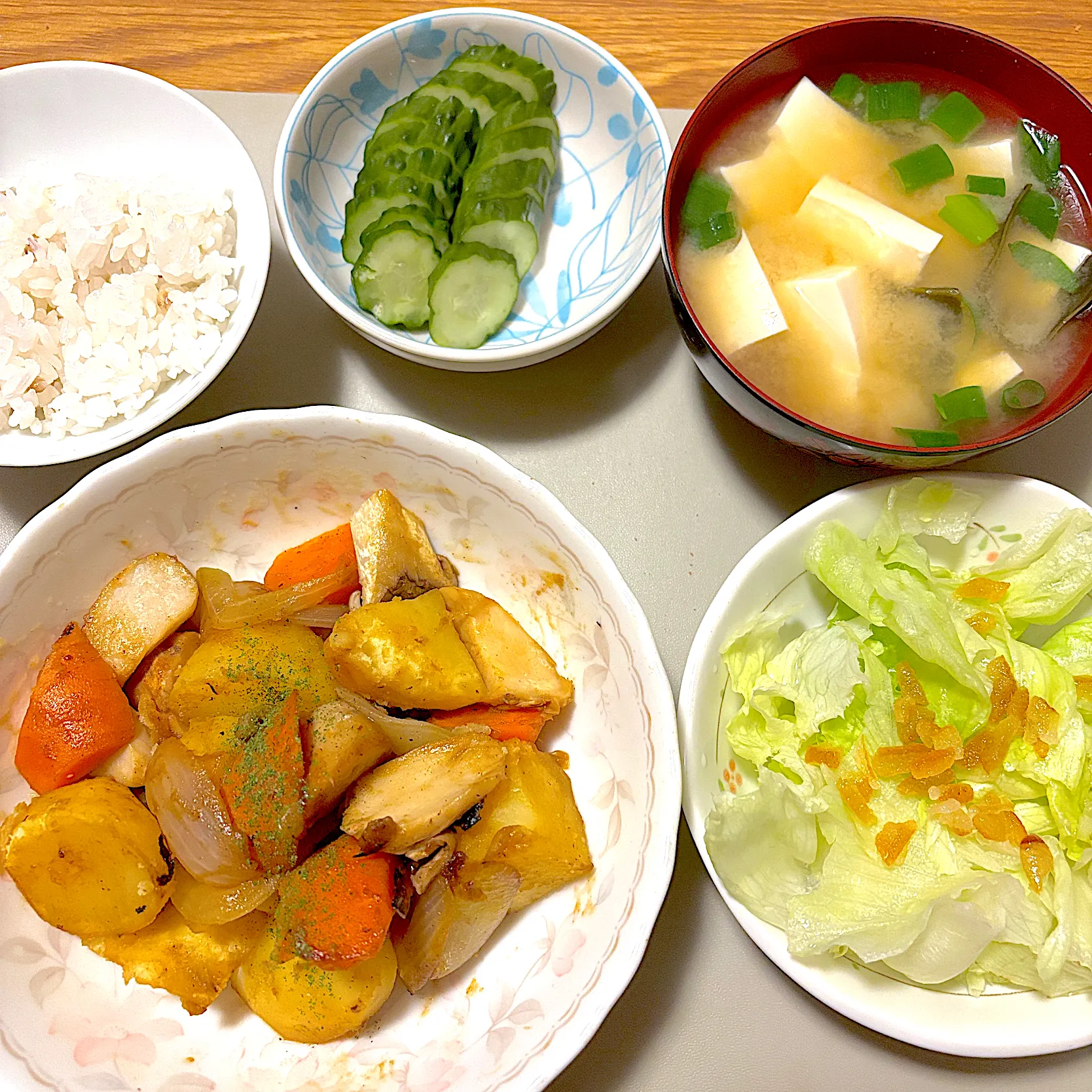 2025/09/26 きたあかり(北海道)カレー炒め、柚子ピールサラダ、きゅうり漬物(無印ぬか漬け)