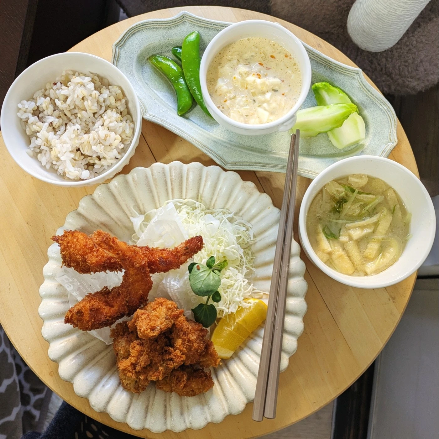 #キヌア #もち麦 #ご飯 #水菜 #薄揚げ #お味噌汁 #千切りキャベツ #国産レモン #クレソン #海老 #牡蠣 #フライ #蕾菜 #スナップエンドウ #自家製 #グリビッシュソース #タルタルソース#ケイパー#コルニッション #玉葱#レモン汁 #マヨネーズ#ゆで卵#砂糖#生クリーム