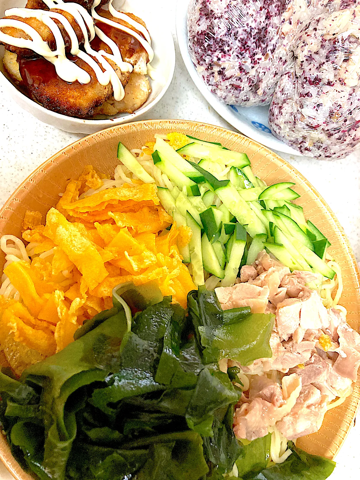 冷やし中華、ゆかりおにぎり、梅ささみカツ