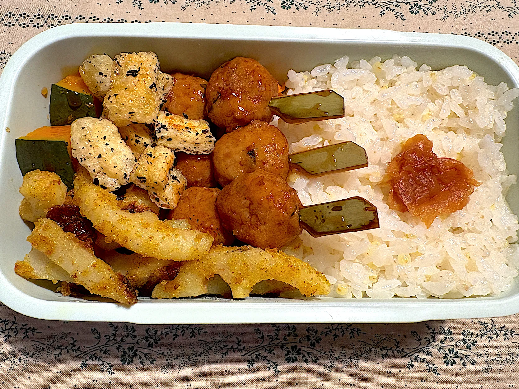 しそつくね、にんじんナムル、蒸しかぼちゃ、蓮根ちくわカレー焼き、油揚げのカリカリしそ風味