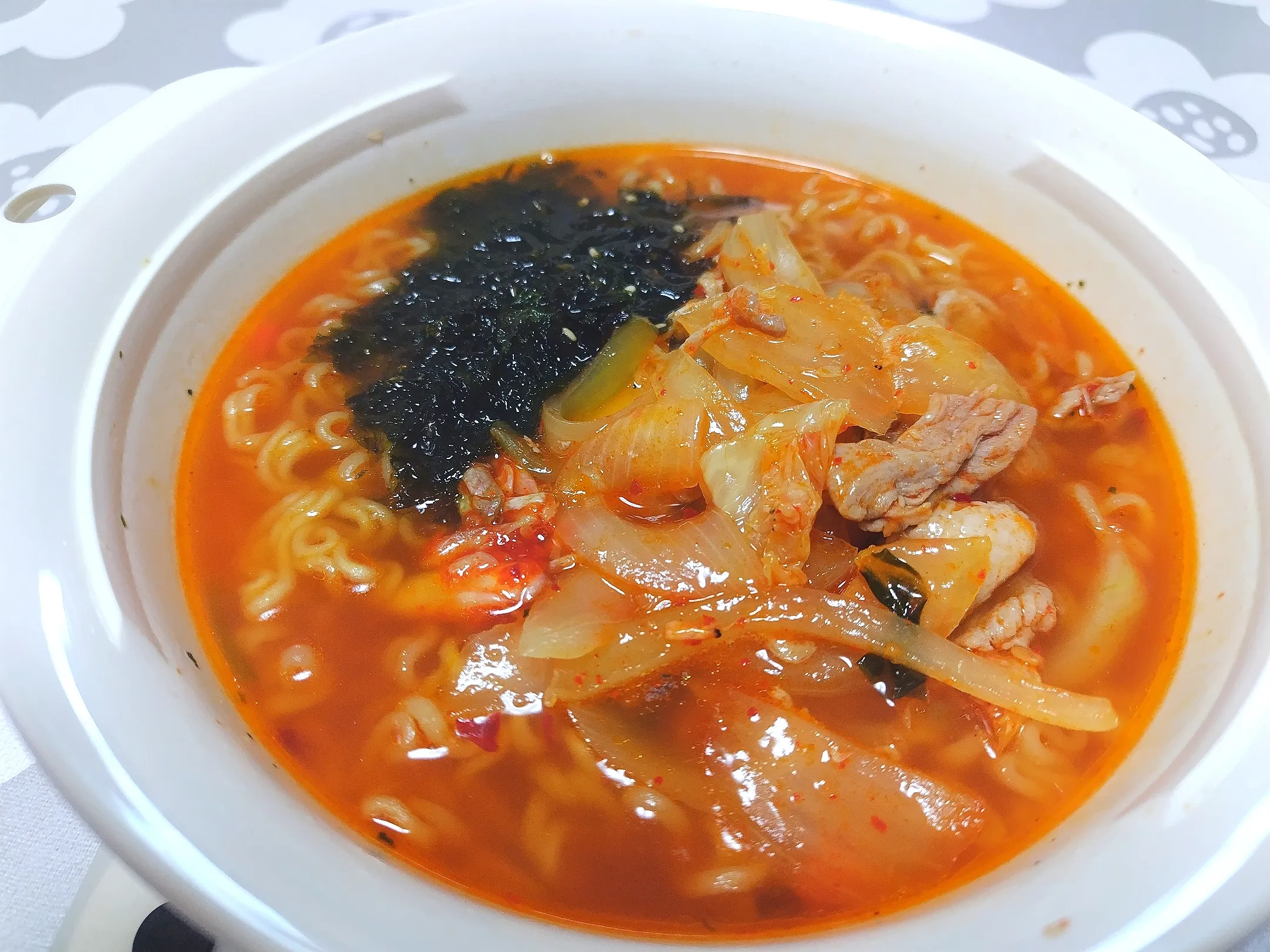 残り物のっけ辛ラーメン #晩ご飯 #レンジで簡単 #インスタントラーメン #韓国 #辛ラーメン #残り物 #豚キムチ #韓国海苔