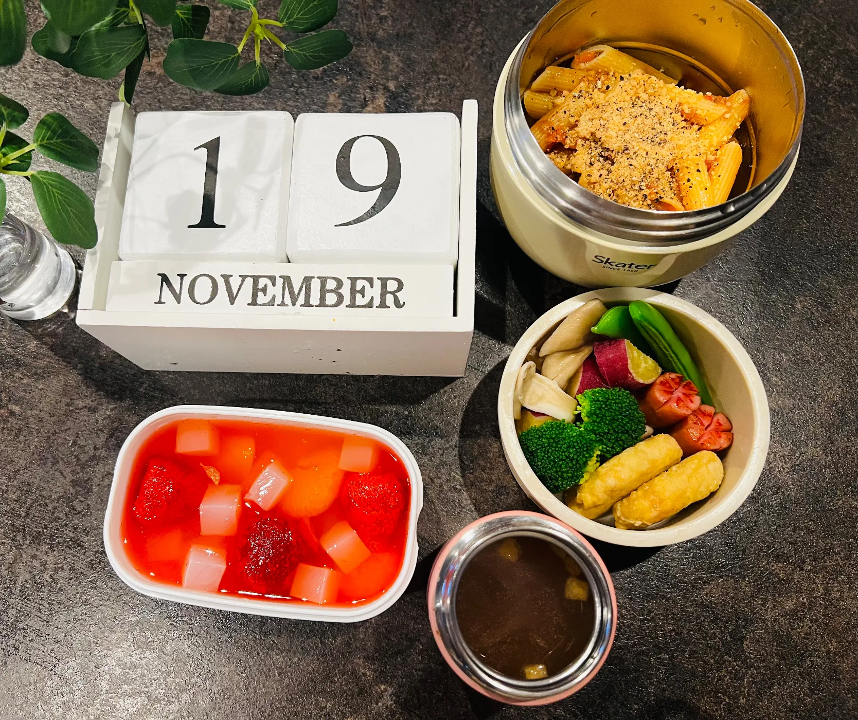 ミートペンネと温野菜とか色々弁当。炭酸ゼリーは苺も入って豪華版