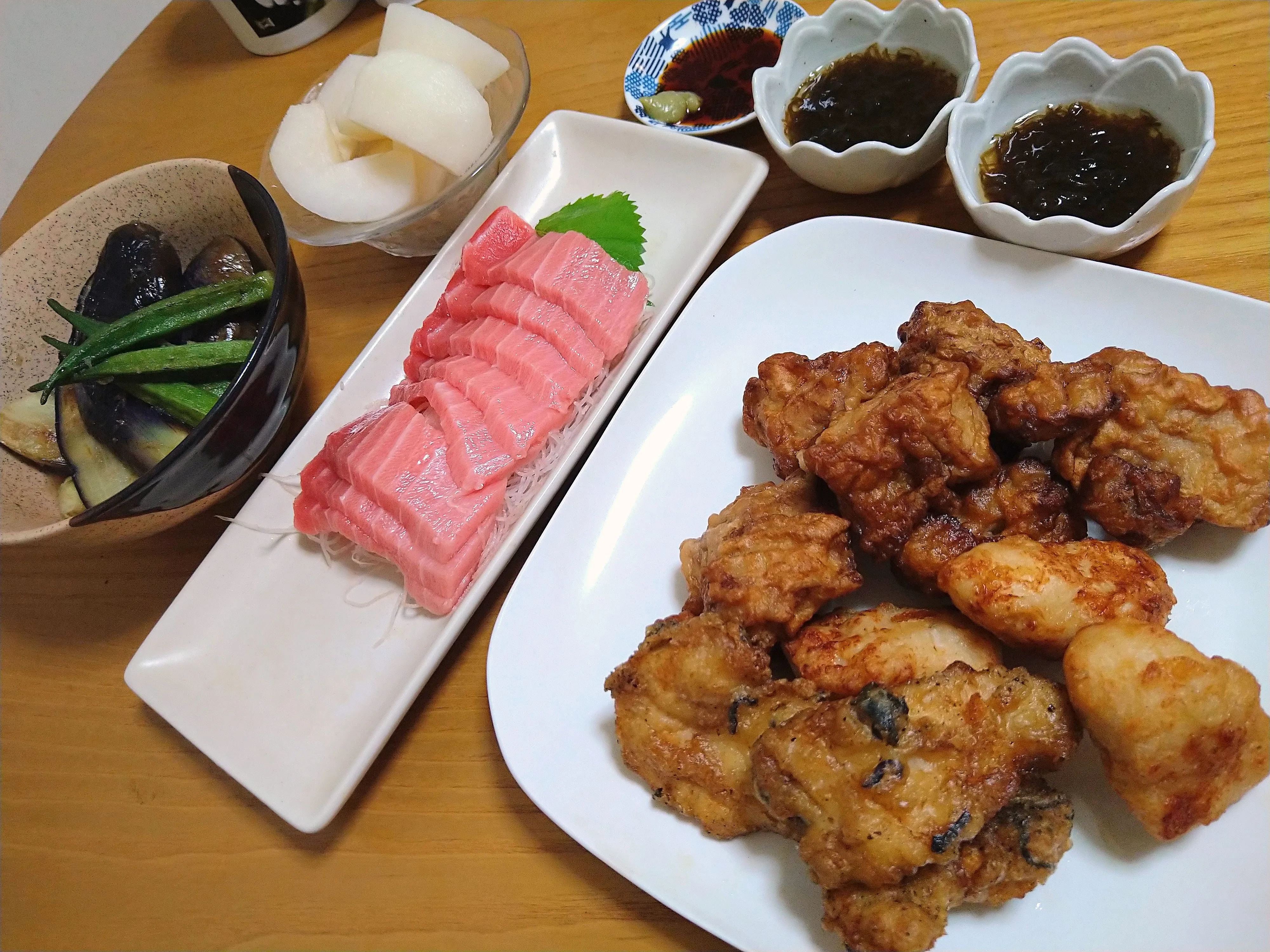 茄子とオクラの焼き浸しと味噌汁作って梨を剥きました