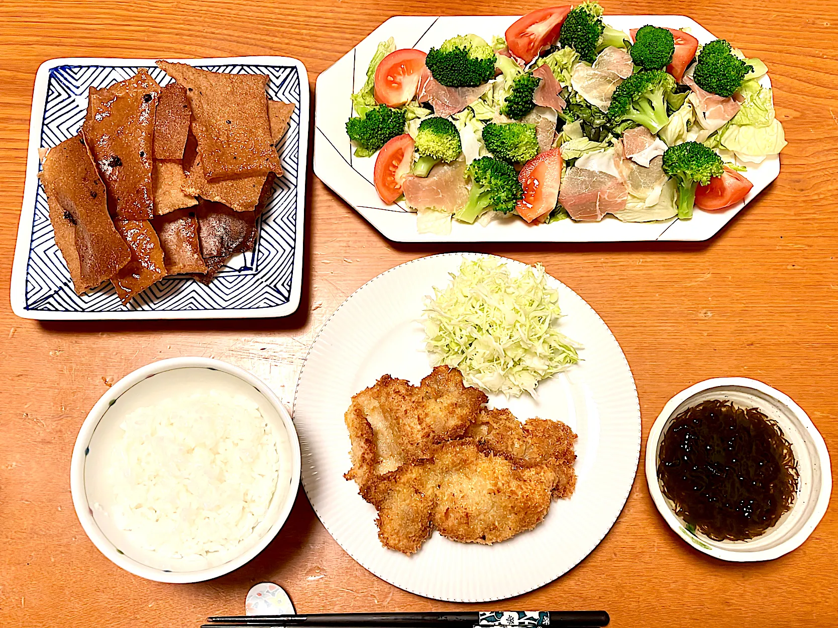 今夜は #白米 #イギリス風カツ #もずく #春巻きの皮の揚げたの #生ハムサラダ