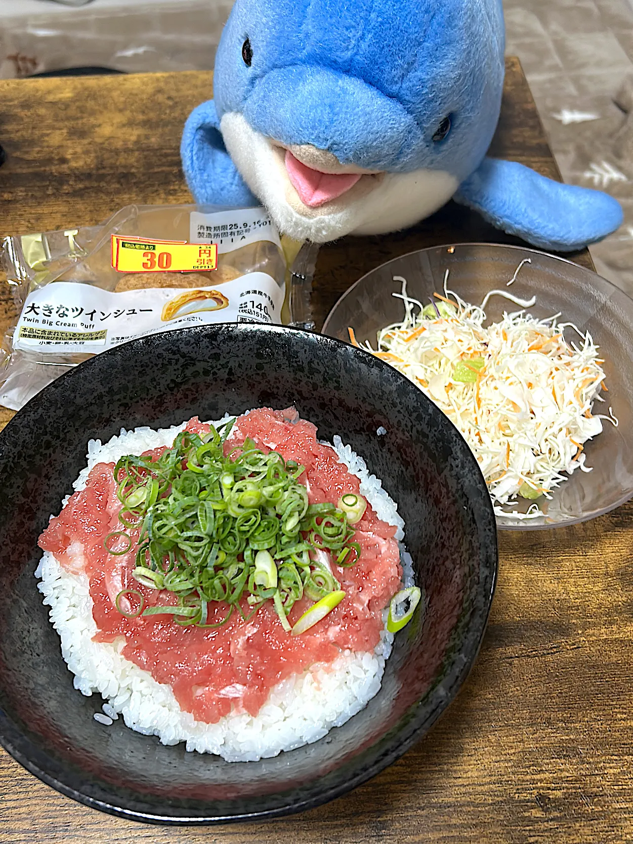 #ネギトロ丼 #サラダ #シュークリーム(ローソン) #男子大学生 #人形 #一人暮らし