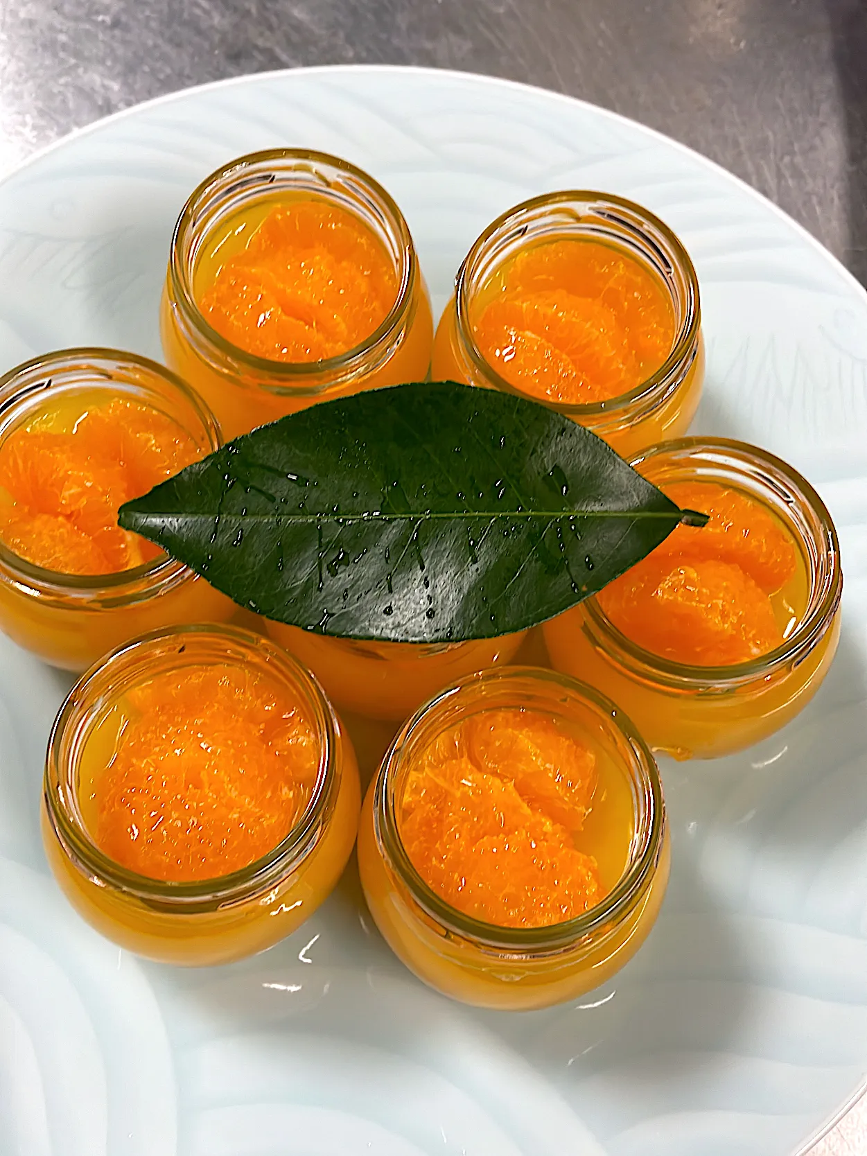 搾りたての蜜柑ゼリー 甘夏の葉っぱを飾って