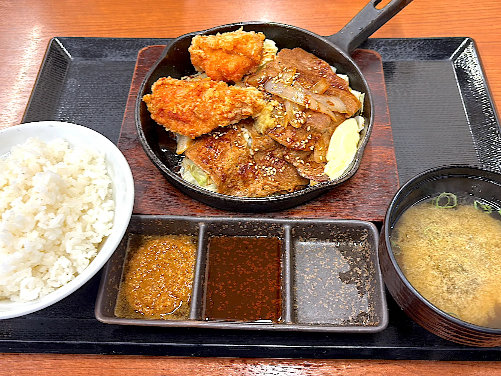 豚肩ロースのしょうが焼き。タレの味が甘くて美味しい。しょっぱくない。上に生姜おろしがどっさり乗ってて生姜感たっぷり。マヨネーズと下に敷いてあるキャベツとの相性がいい。唐揚げは2種類のタレがある。1つはニンニク胡麻の甘だれ。1つはかなりの甘醤油だれ。好みは分かれるが美味しい。唐揚げもかなり大きく表面の衣がカリカリで特徴的。美味しい。AA