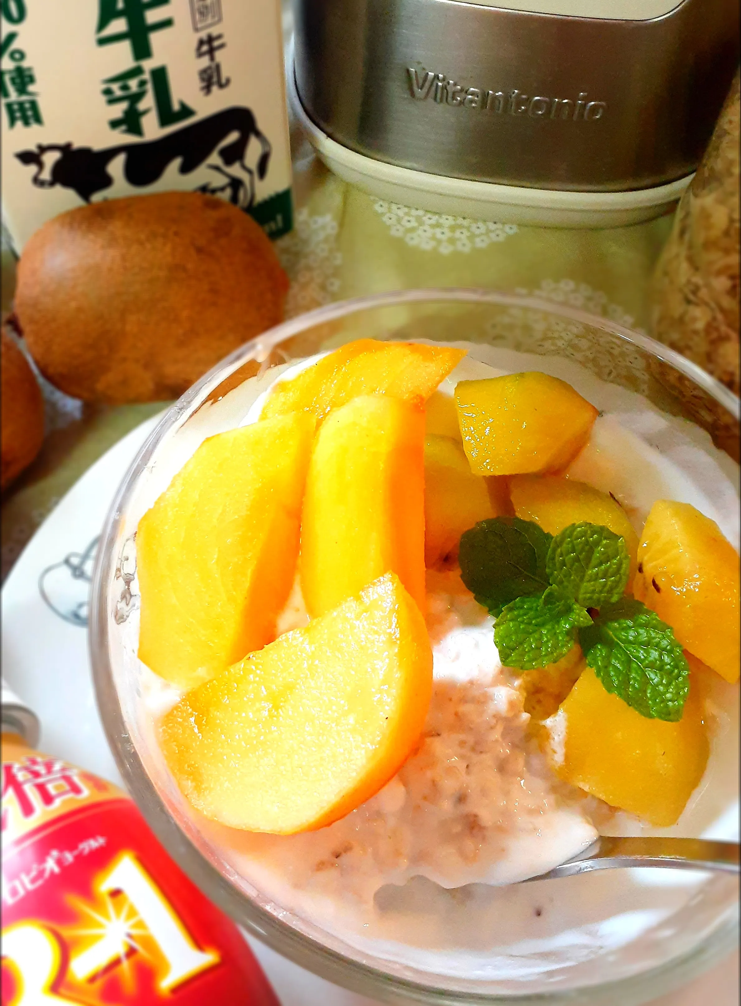 ビタントニオヨーグルトメーカーで自家製ヨーグルト。下にはオートミール、トッピングは地元産の柿とキウイ🥝ビタミンCも大事です!