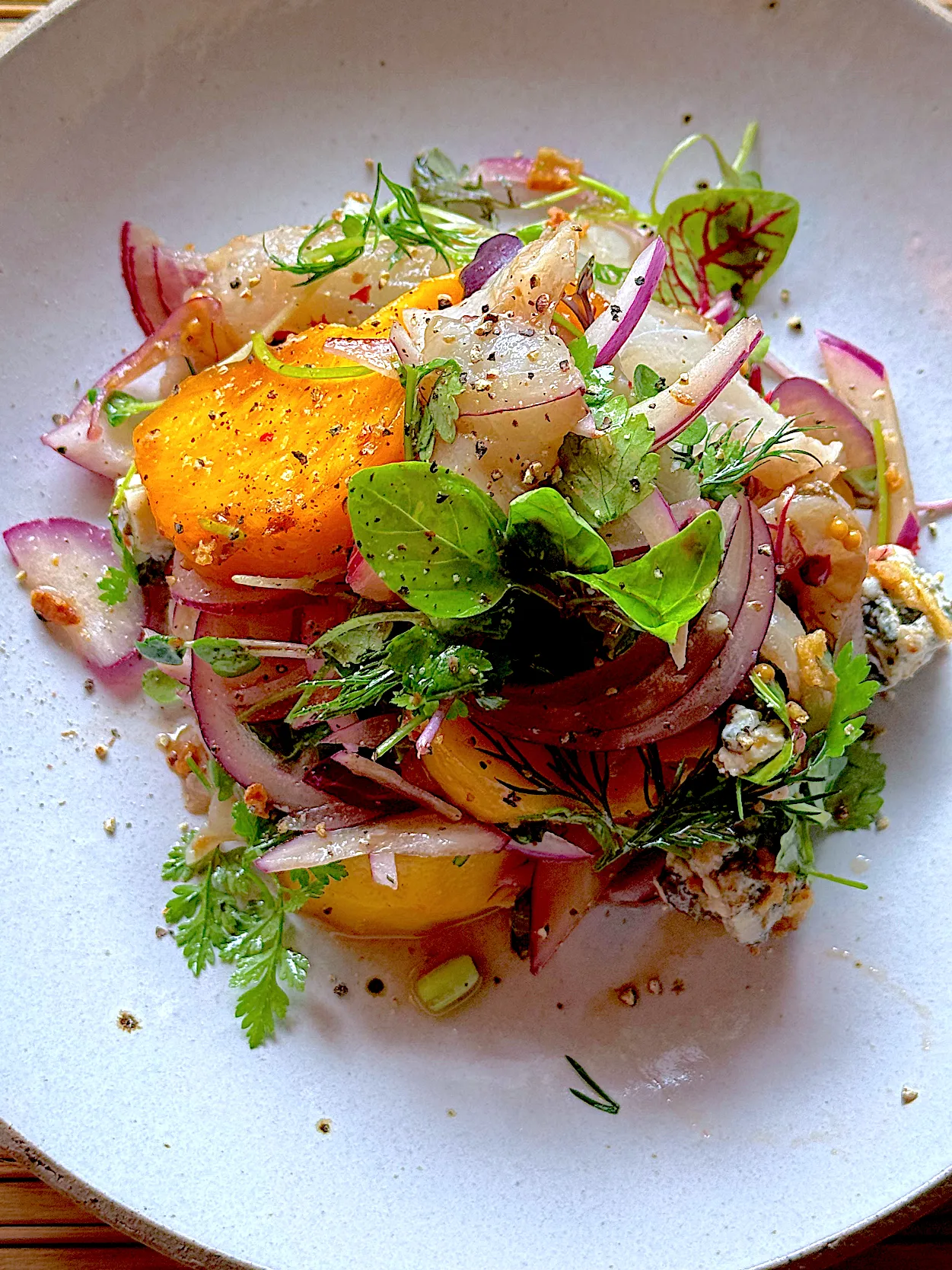 #平目 #柿 #ハーブ #赤玉ねぎ #ゴルゴンゾーラ #セビーチェ #カルパッチョ #フルーツサラダ #ペルー料理 #家庭料理 #モダン料理 #モダンアメリカ料理 #onekiln #onekilnceramics