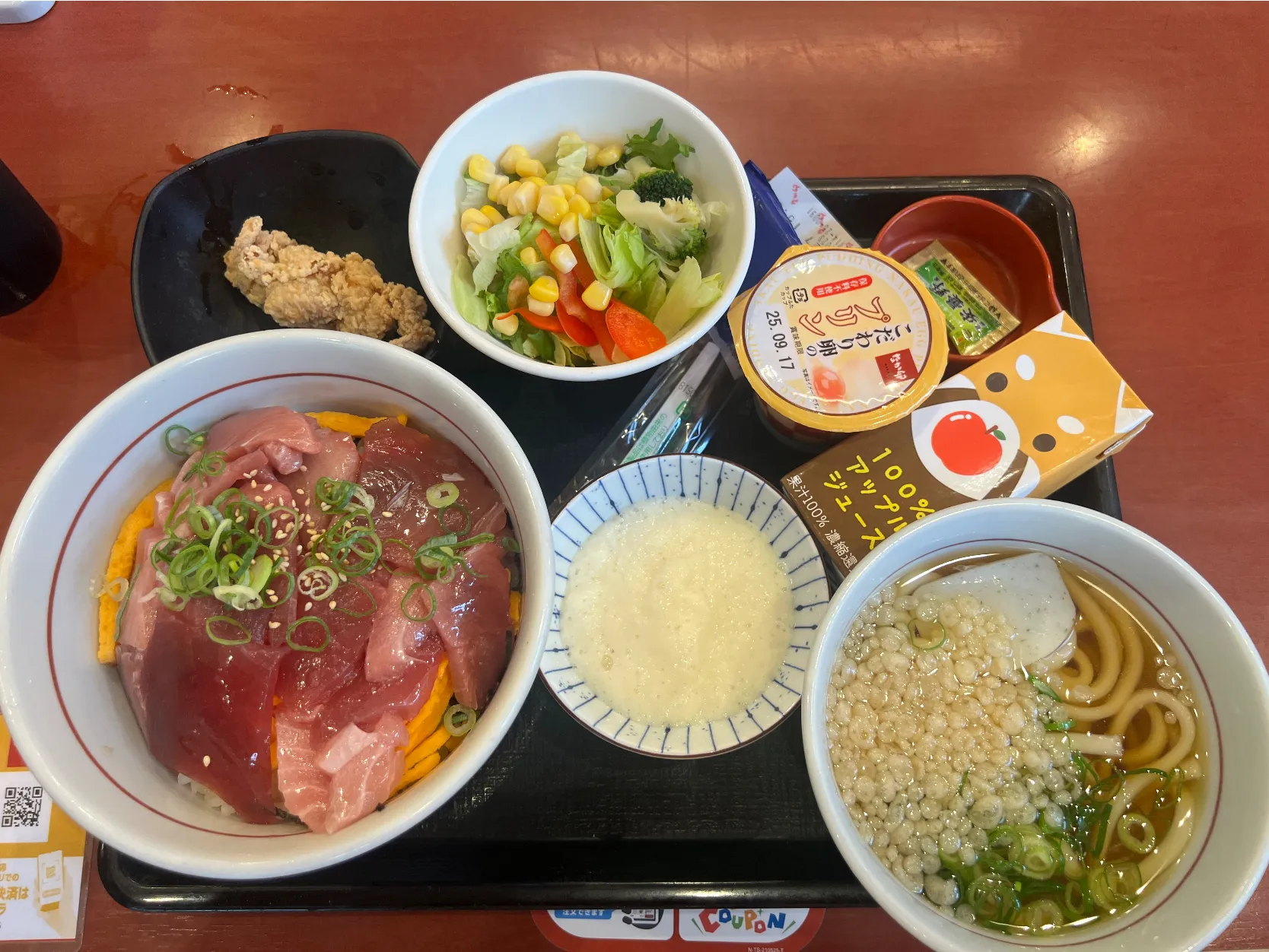 海鮮丼(まぐろ、イカ)、しじみのお味噌汁、きのことれ...